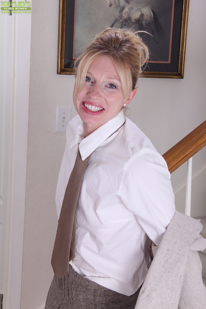 Classy blonde MILF Holly Jones peels off her work uniform to reveal her hairy pussy, spreading wide for a nude PAWG tease—natural tiny tits and amateur allure after hours.