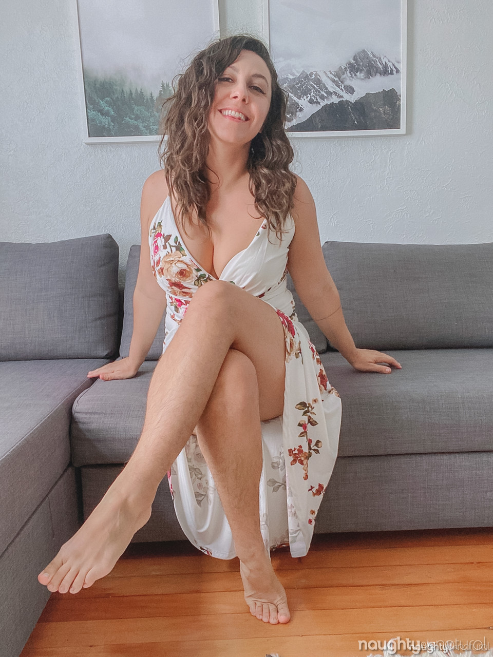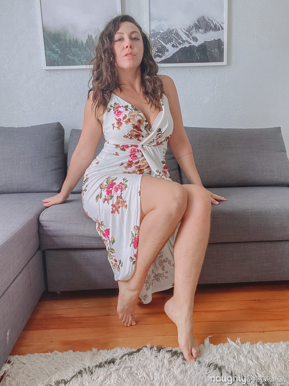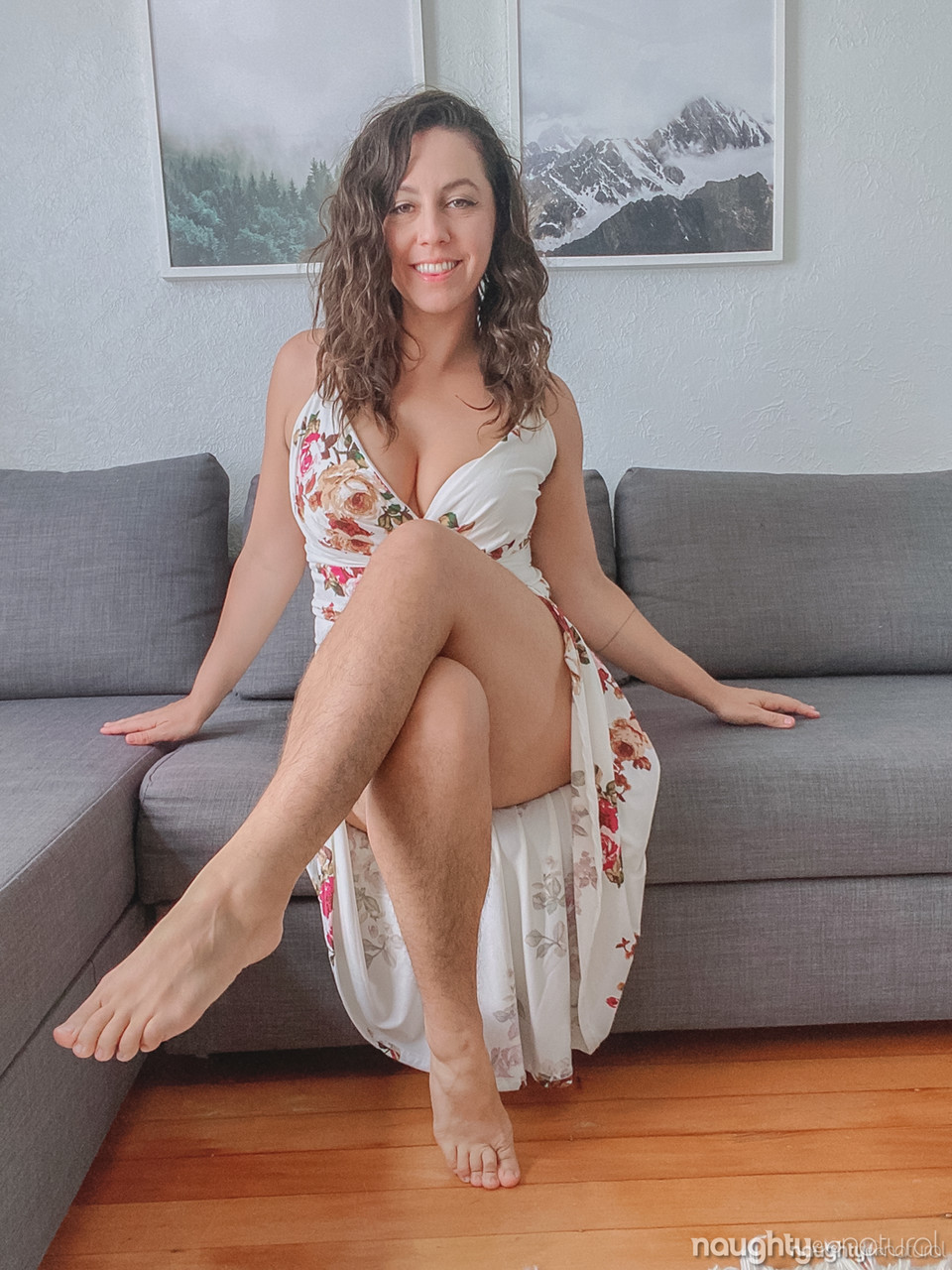 Amateur MILF Nikki Silver teases in a summer dress, revealing juicy breasts and a lush hairy bush—perfect legs, feet, and downblouse glimpses of a beautiful naked woman.