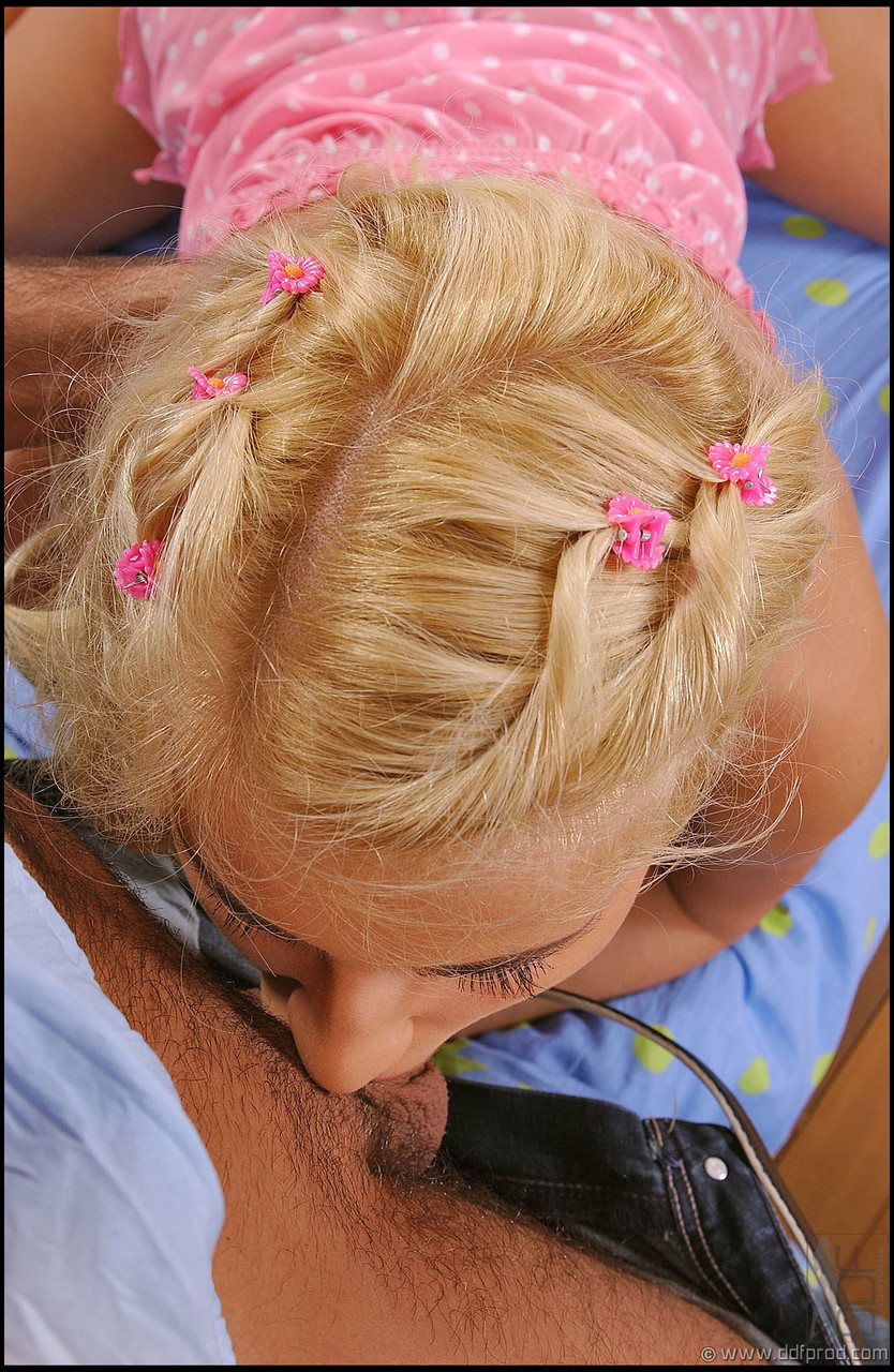 Pamela's 1 By Day teen anal, deepthroat & cumshot photo set: blonde teen blowjob, pussy close-up, hardcore ass fuck, ball licking, bent-over panties-down action.