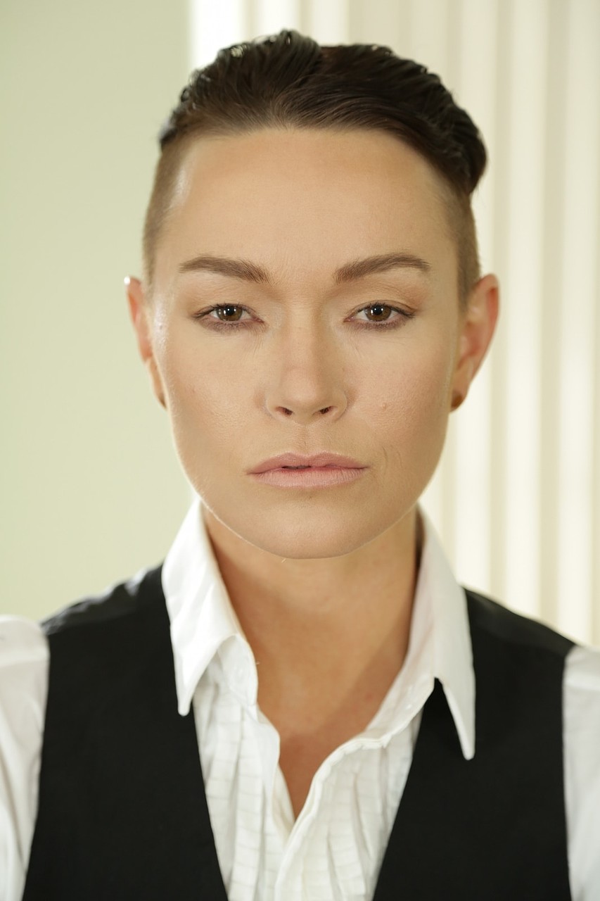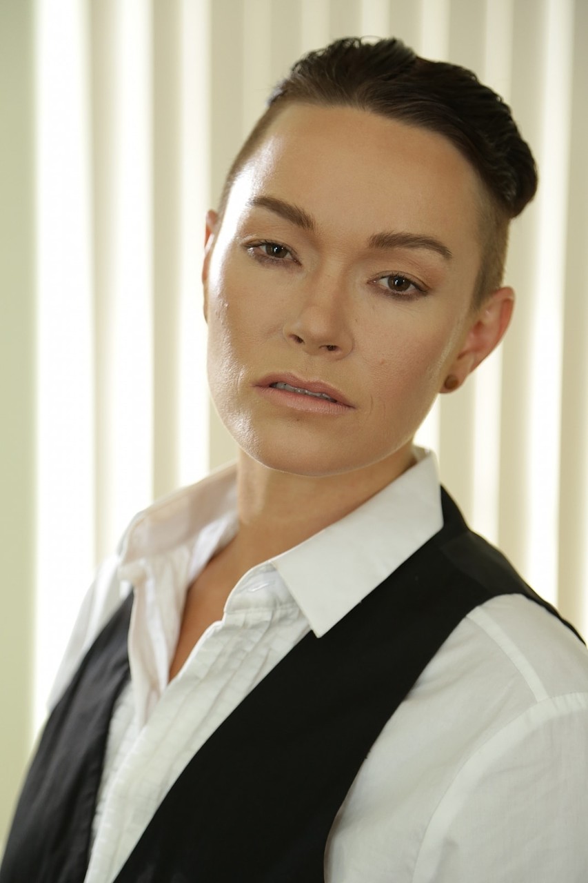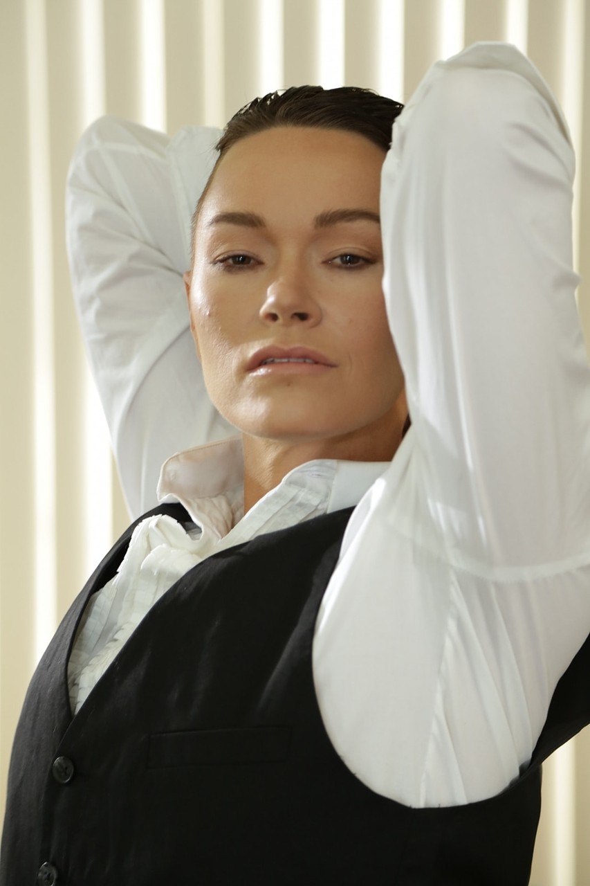 عارضة أندروجينوس ذات الشعر القصير جيز لي تتصور في زيها الرجالي - معلومات المعرض