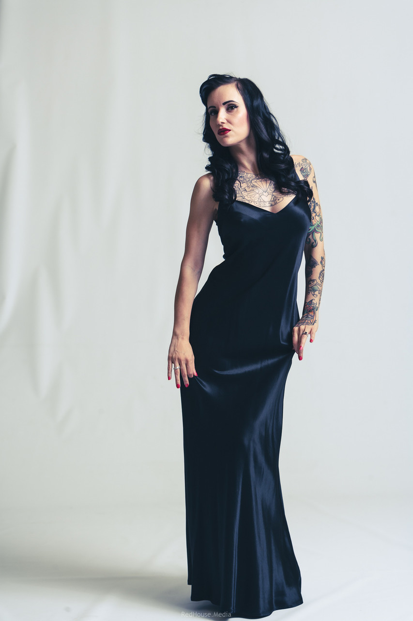 عارضة البين-أب ذات الأوشام سامي لين تخلع فستانها الأسود الكلاسيكي، تكشف عن منحنيات ريترو وبشرة منقوشة في أوضاع عارية إيروتيكية.