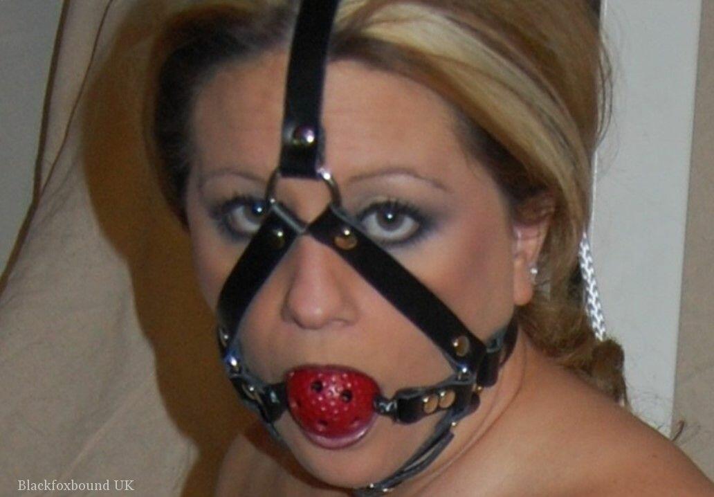 شقراء سمينة مكبلة الفم عارية الصدر في بنطلونات أرجوانية من القيد