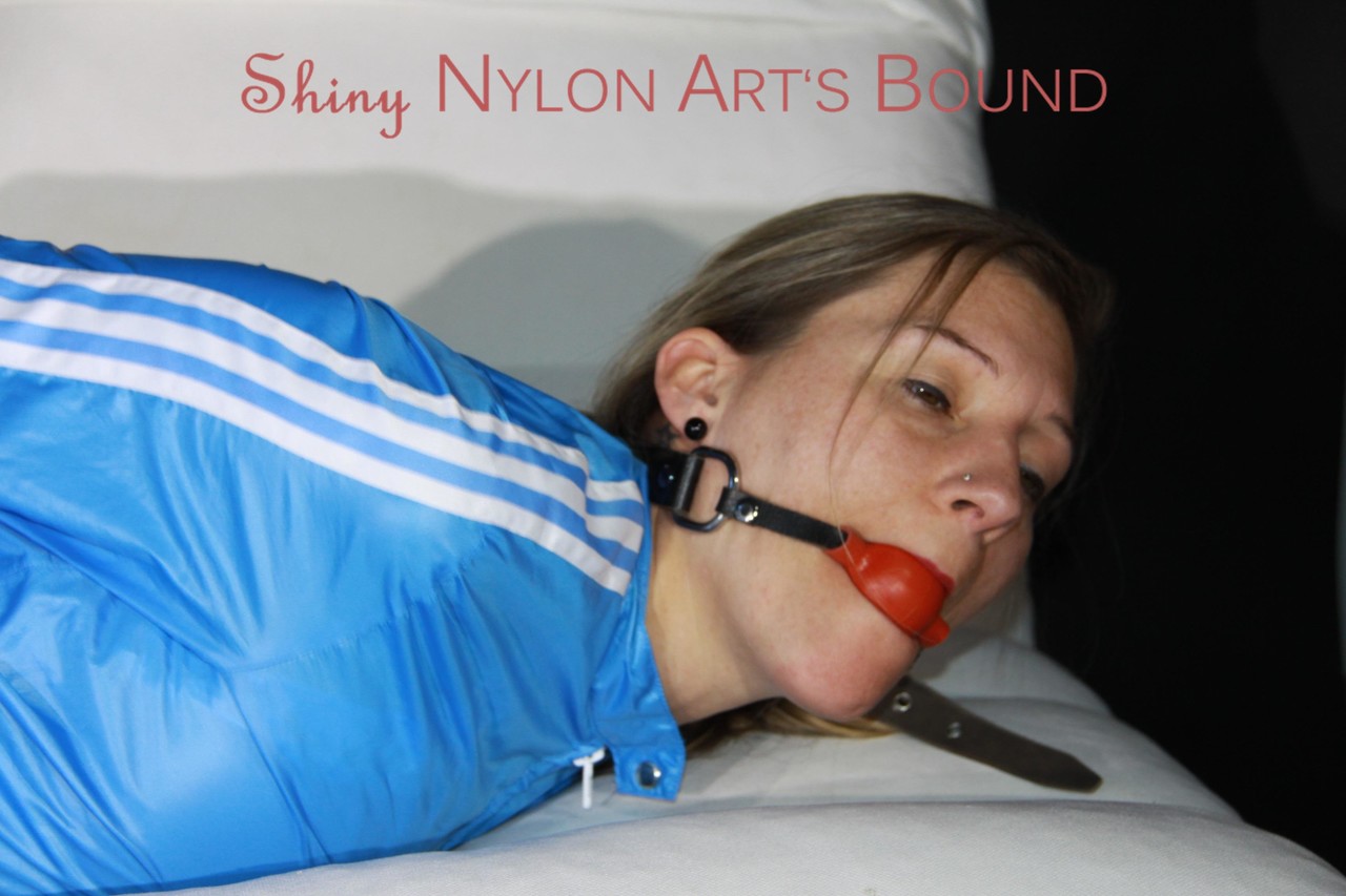 فتاة بيضاء مكممة بالكرة مربوطة على فراش فوتون ببنطلون نايلون أحمر - معلومات المعرض