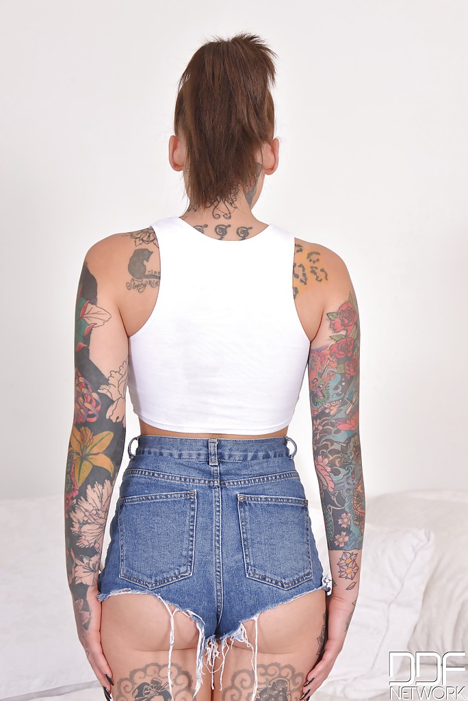 الفتاة المُغامرة ذات الوشم الكثيف لورين تتعري، وتنتشر ليكشف عن مهبل منحوت ومخوزق وقصاصات صغيرة ذات حلمات مخوزقة، وتتخذ وضعية في سروال قصير فقط.