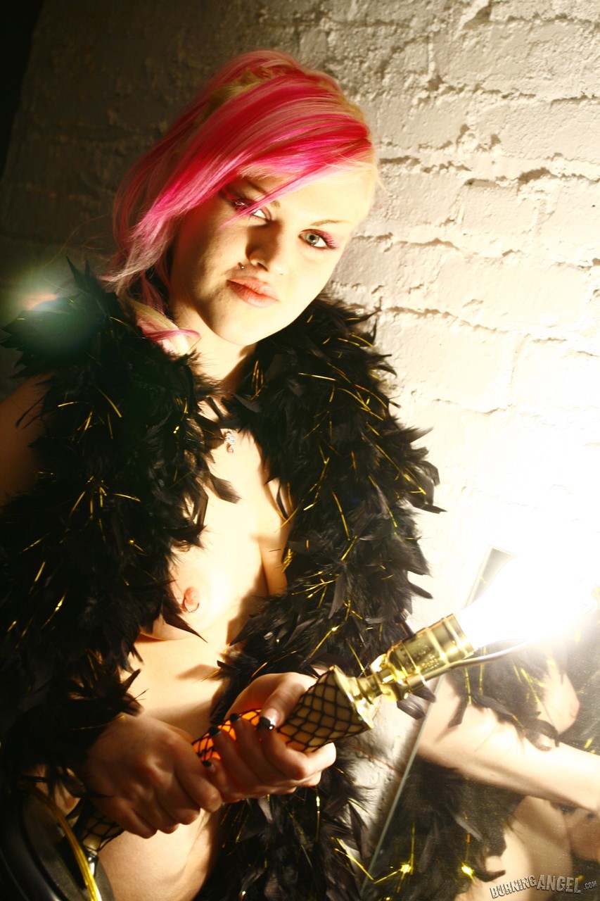 جاد جولي الموشومة بشعر مصبوغ تتعرى في وشاح من الريش - معلومات المعرض