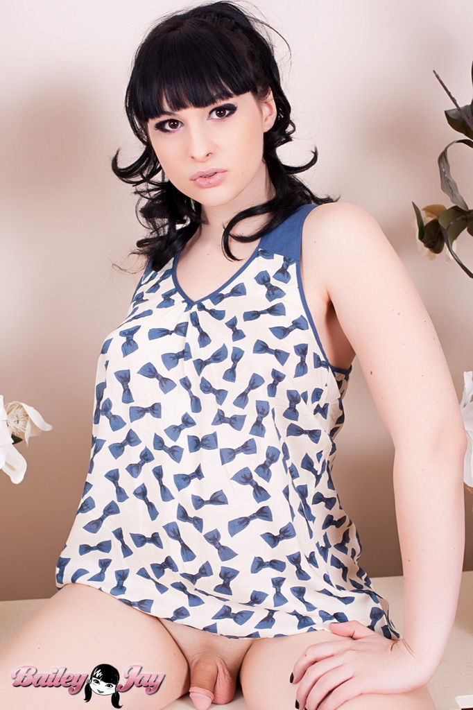 تستلقي تي إس بيلي جاي في بلوزة زرقاء مريحة، تُبرز ساقيها الطويلتين كـ شيميل وعضوها اللاتيني الضخم في معرض متحولين جنسيًا رائع.