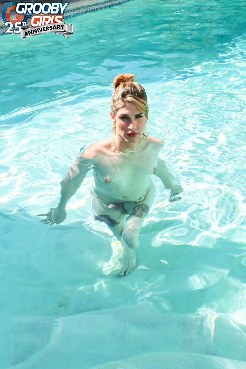 العارية بالوشم كالي غريس تُظهر شرجها وقضيبها بجانب المسبح - معلومات المعرض