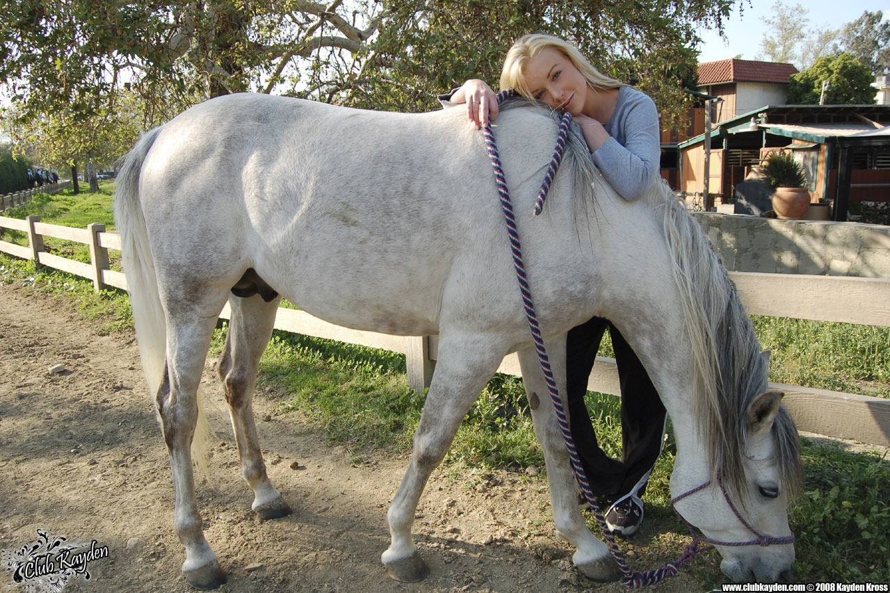 الأمريكية الناضجة الشقراء كايدن كروس تلعب مع حصانها في المزرعة