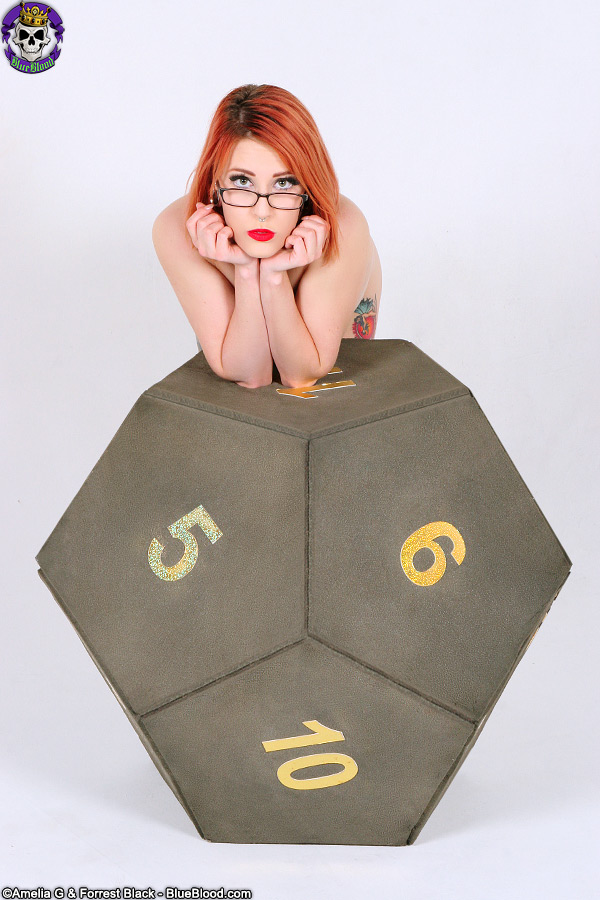 عارية ذات شعر أحمر مرسومة عليها أناستاسيا بير ترتدي نظارات وتتصرف على مكعب اللاعب - معلومات المعرض