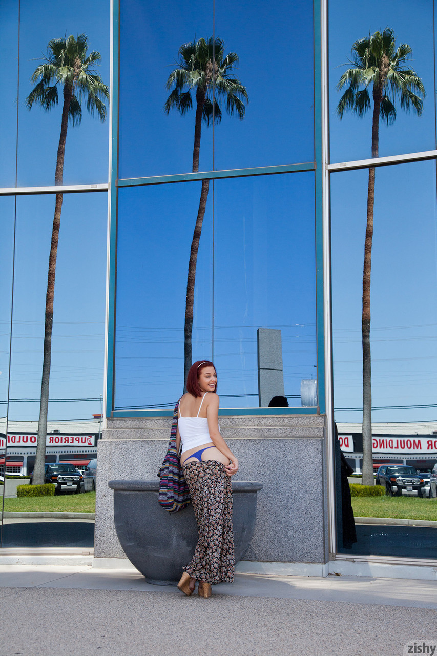 المراهقة الحمراء الشعر المتوهجة جيسيكا روبين تتباهى بثدييها الطبيعيين الكبيرين في متجر عام، جمال أحمر الشعر القصير يغازل في الخارج.