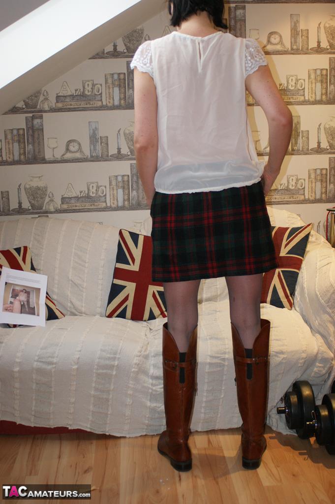 الهاوية سوزان في طاقية وملابس داخلية ترفع سراويلها لتكشف عن كسها الشعر المتقدم في السن، تلاعب مع اللعبة تحت تنورتها.