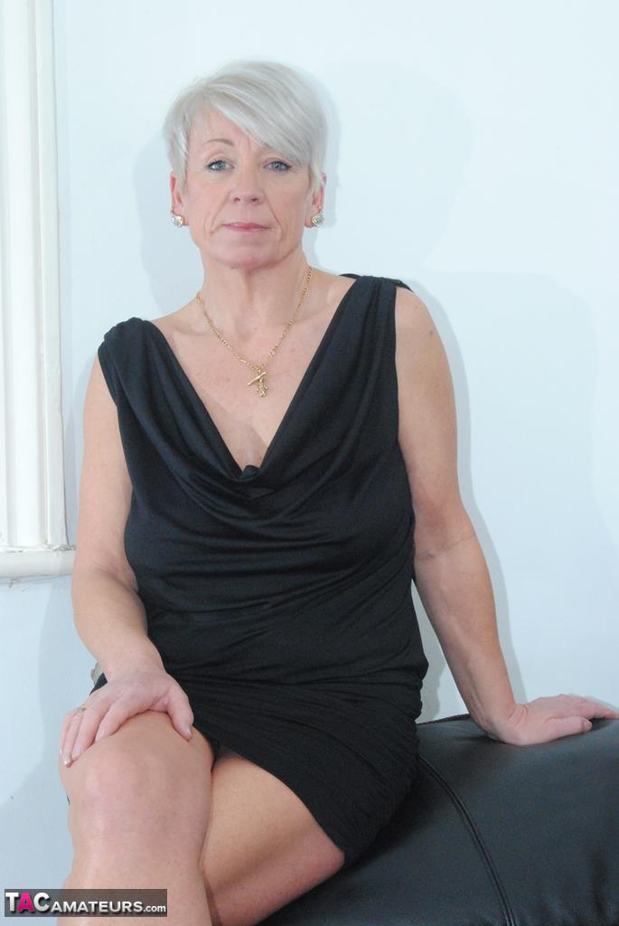سيدة أنيقة ناضجة شازzy ب تظهر ثديين جنسيين و مهبل في فستان أسود