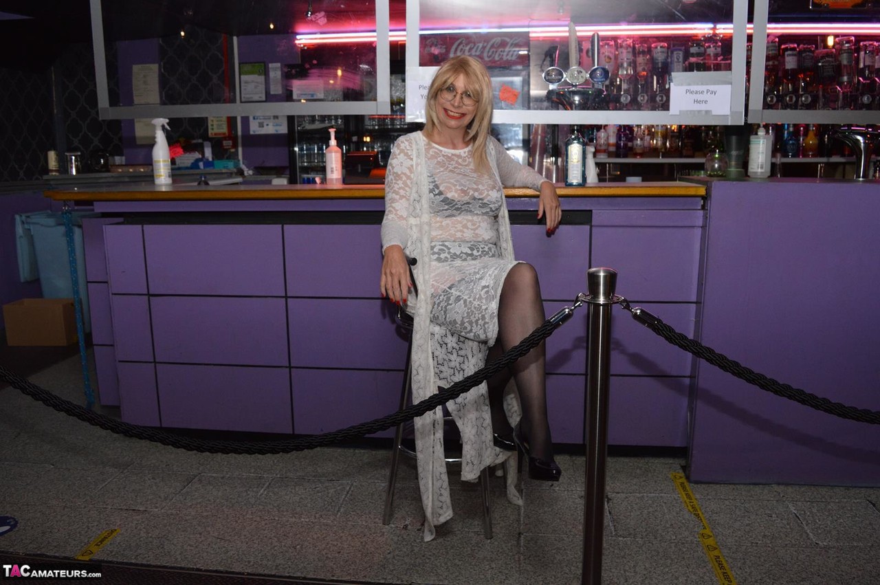 الناضجة البريطانية الهواية باربي، فوق الخمسين، تتعرى حتى الجوارب والكعب العالي والملابس الداخلية في سينما جنسية، تفتح ساقيها المحلوقة لتبرز ثدييها الكبيرين لعشاق بورنو الجوارب الحقيقيين.