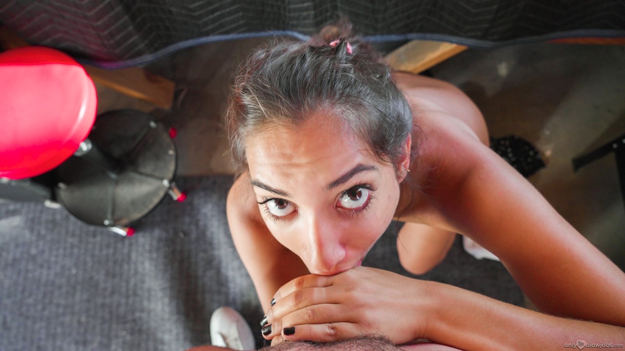 الأميرية السمراء كيتي ريفيرا تركع بملابس داخلية مثيرة، تمتص بعمق زب ابن زوجها الكبير بأسلوب POV حتى يقذف فوق صدرها الطبيعي الصغير.