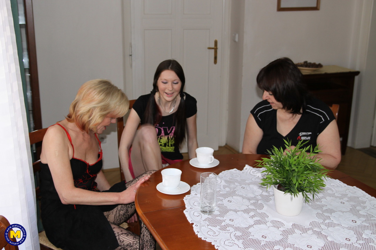 أمّان ومراهقة يتعرّين ويعانقن ويلعبن مع بعضهنّ باستخدام ديلدو بالحزام - معلومات المعرض