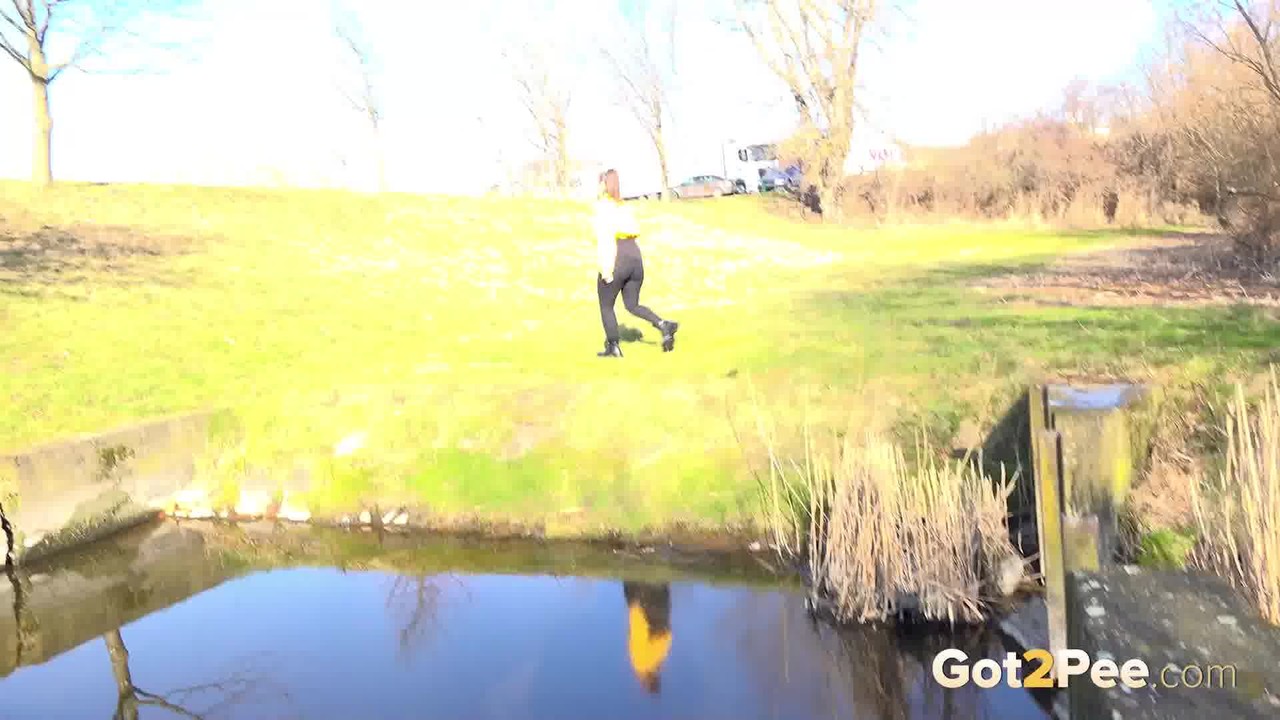 الفتاة القوقازية نيكوليت نوور تتبول بشدة بجانب البركة - معلومات المعرض
