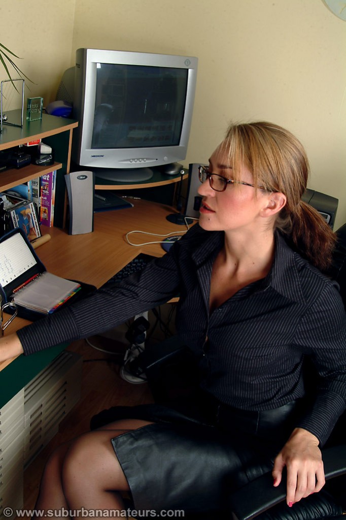 المساعدة الإدارية البريطانية إيلين كول تخلع الملابس حتى الكلسون، وتنتشر في نظارات نيردية، وتحفز مهبلها الهواة بعصا زجاجية، بينما تتهيج قدميها في الكلسون.