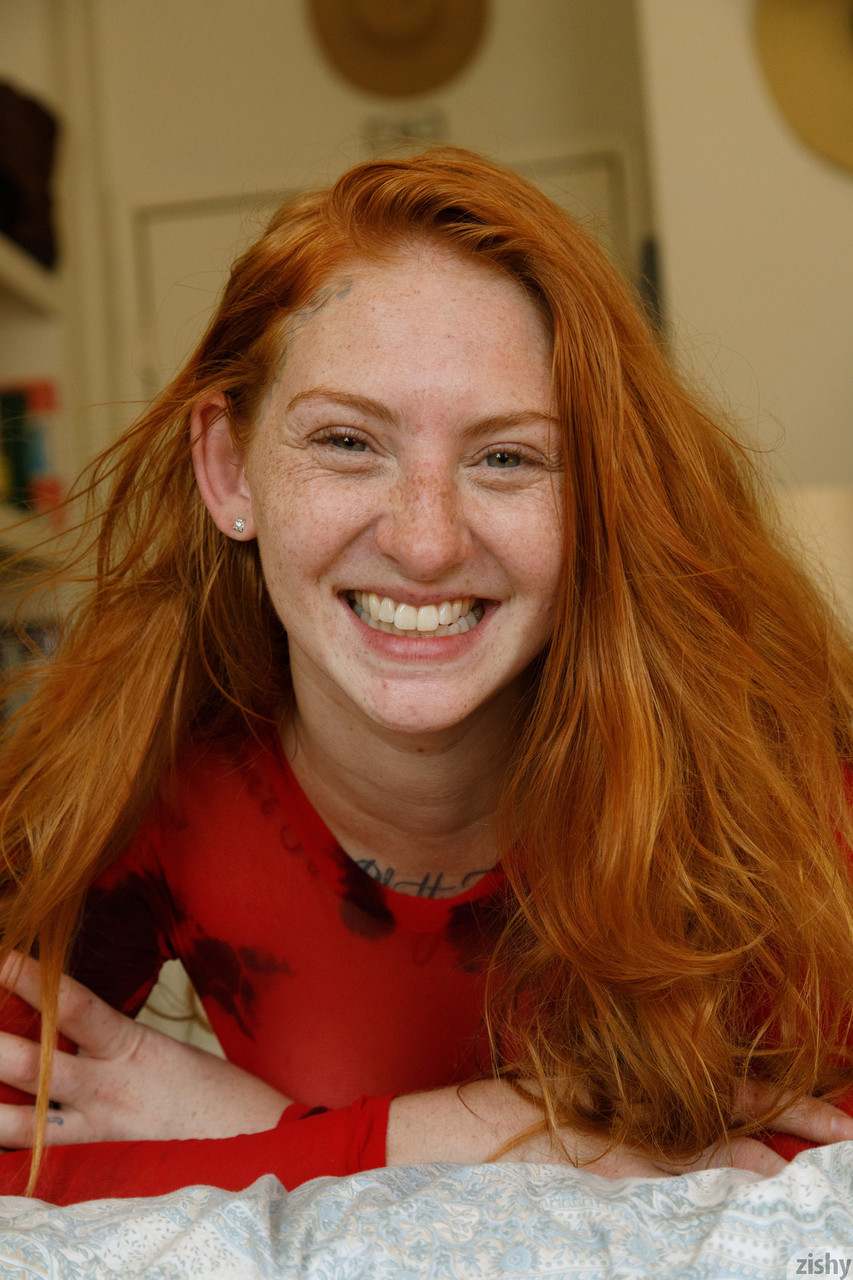 شابة حمراء الشعر متبقعة يوليو سبتمبر تثير في المنزل ، وتفتخر بذيلها الشاحب المطبوّع وفرجها الضيّق الأحمر الشعر في ظهورها الأول كزوجة ربة منزل هاوٍ.