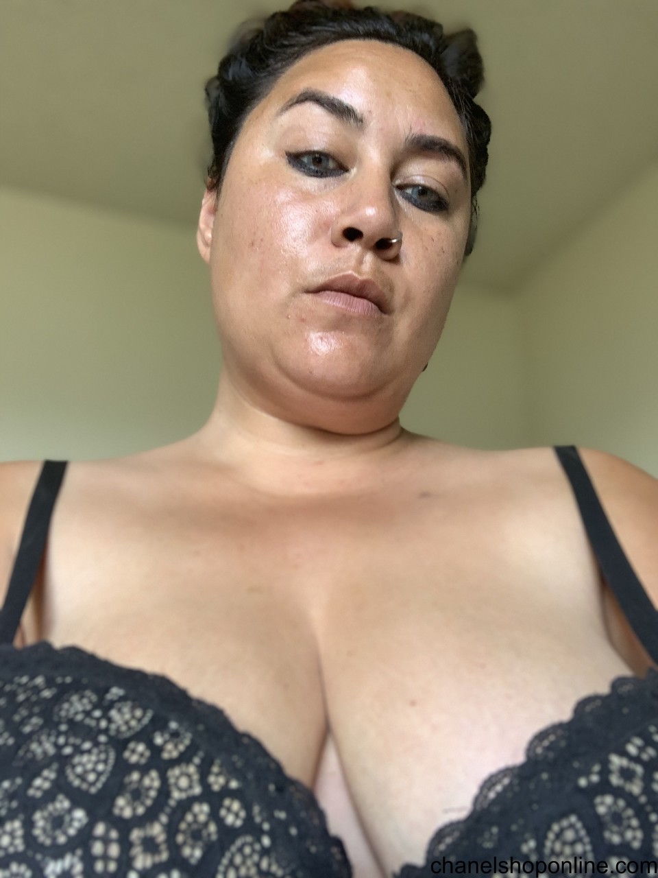 امرأة ناضجة تتصوّر بحمالة صدرها تُظهر صدرًا جذابًا