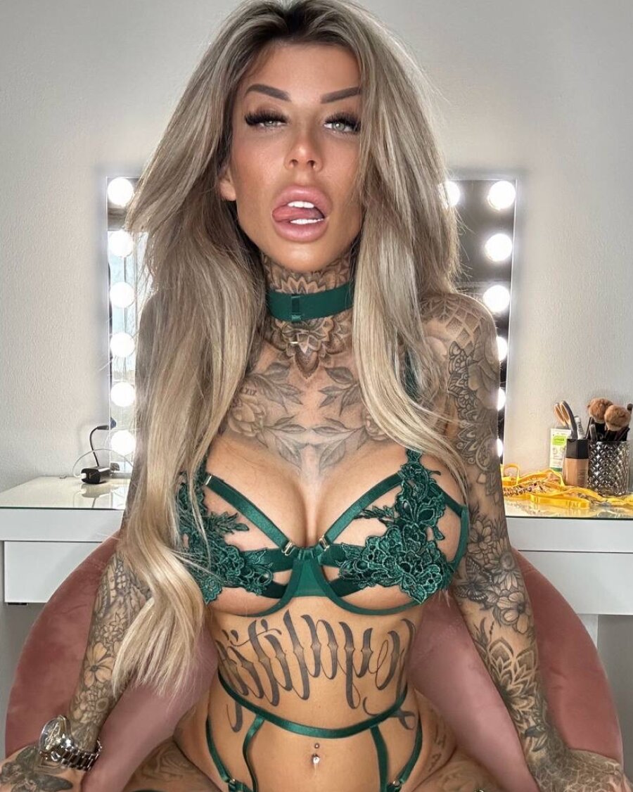 الناضجة الطويلة الموشومة جاكي إنكد تُظهر ثدييها الكبيرين المثاليين ومنحنياتها الموشومة في ملابس داخلية خضراء دانتيل. عارضة الجمال الشقراء الأماتورية الجذابة تتصوّر منفردة.