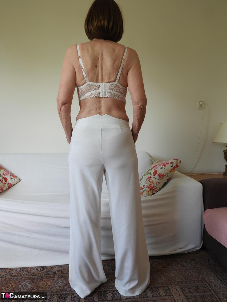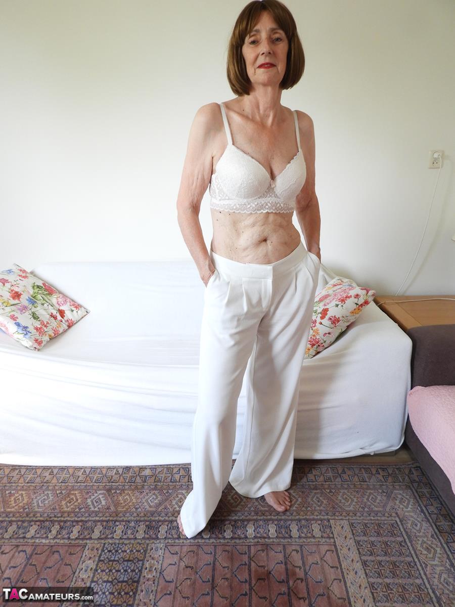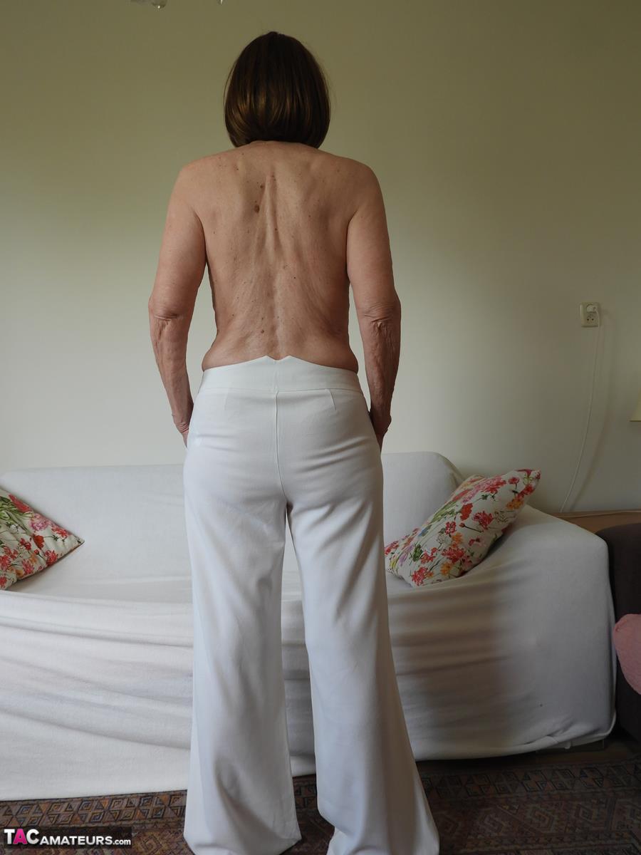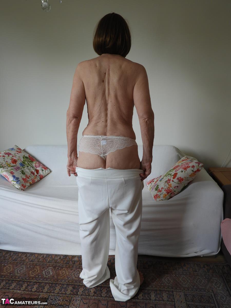 الجدّة العجوز جداً كات كيتي، فوق 70، تتعرى تماماً، تفرد ثدييها المترهّلين ومؤخرتها البيضاء الكبيرة في ملابس داخلية هواة، وتغري بفتحة شرجها حافية القدمين.
