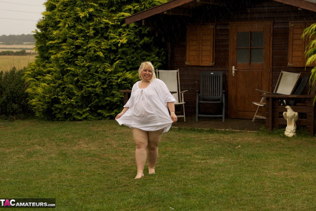المرأة البدينة الناضجة الشقراء ليكسي كامينجز تكشف عن جسدها على العشب الخلفي - صورة 3 / 20