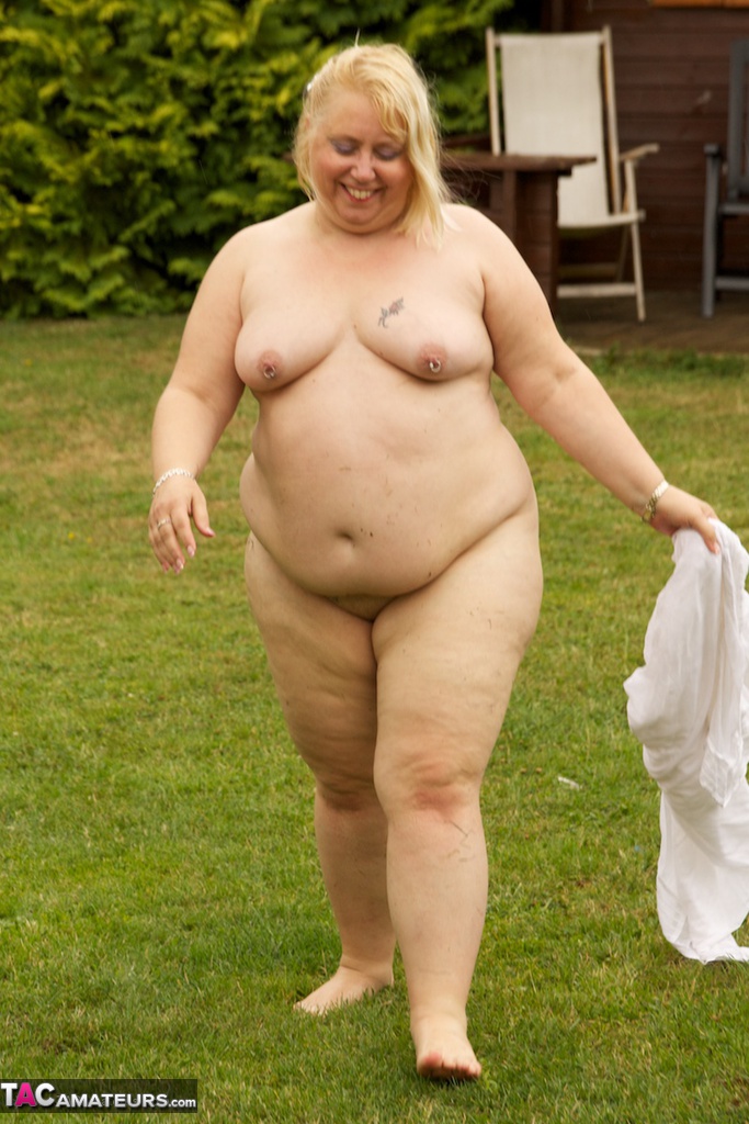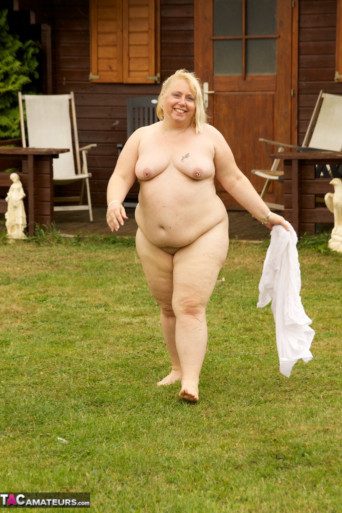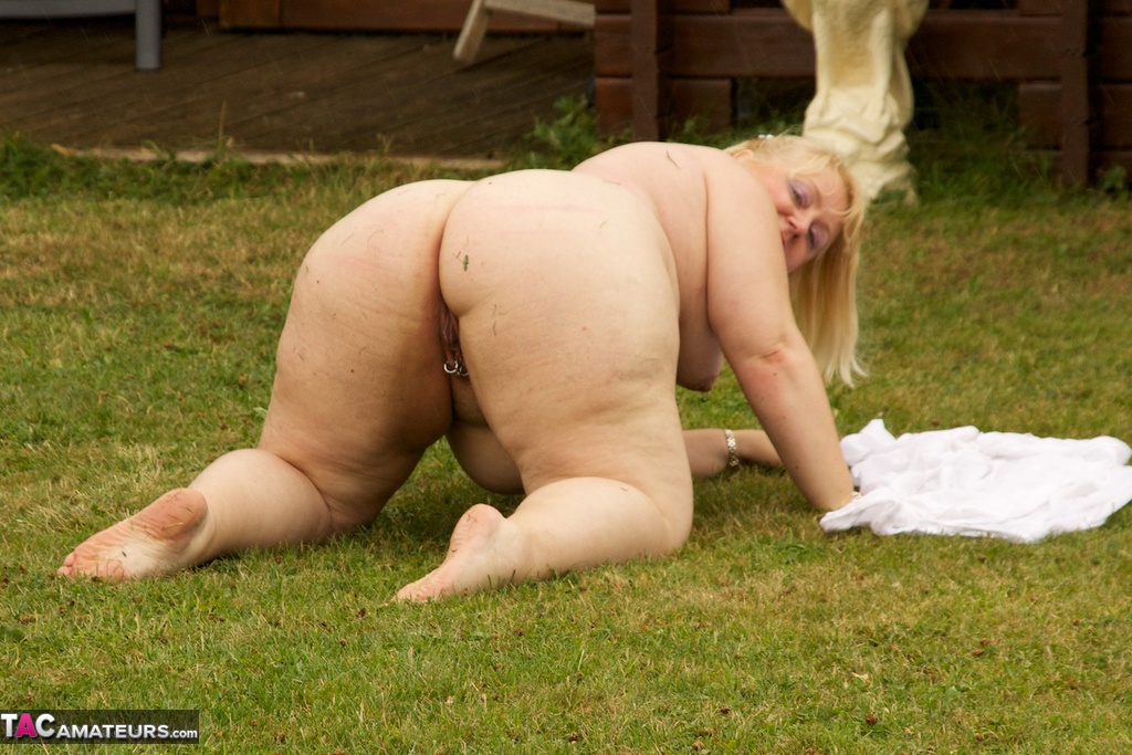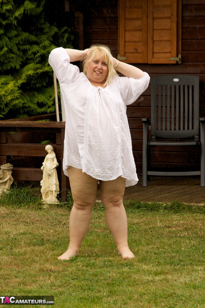 المرأة البدينة الناضجة الشقراء ليكسي كامينجز تكشف عن جسدها على العشب الخلفي - معلومات المعرض
