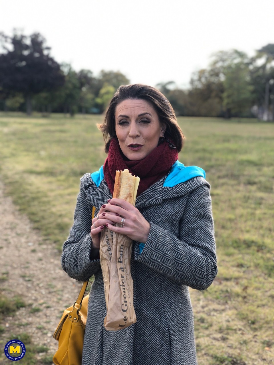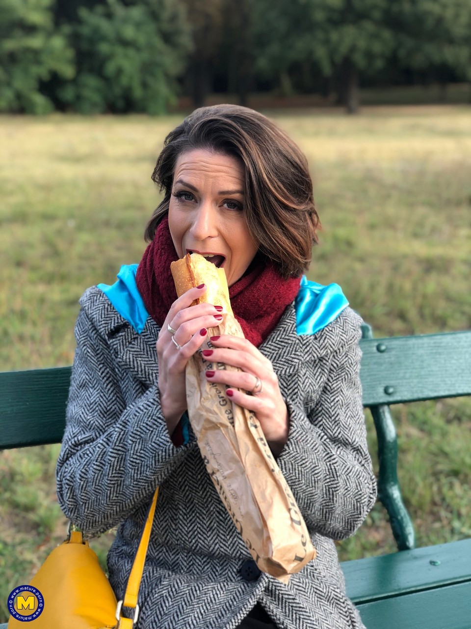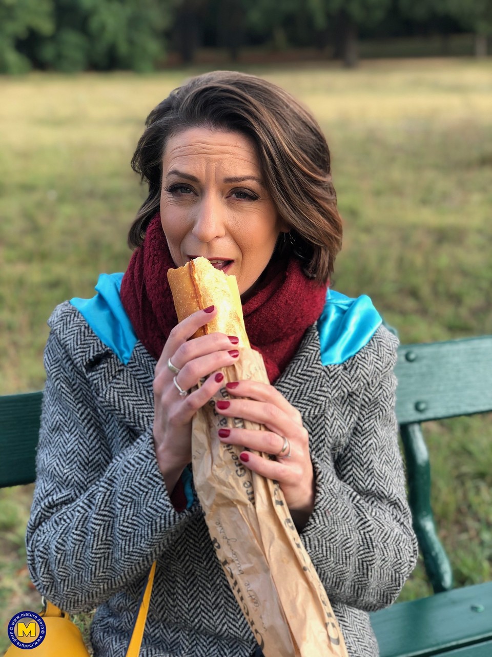 الأم الفرنسية الجذابة آنا، 60+، تغازل في الهواء الطلق بجوارب شفافة، تُبرز ساقها الناضجة أثناء تناول الشطيرة — أنيقة، حقيقية، وذات خبرة لا تقاوم.