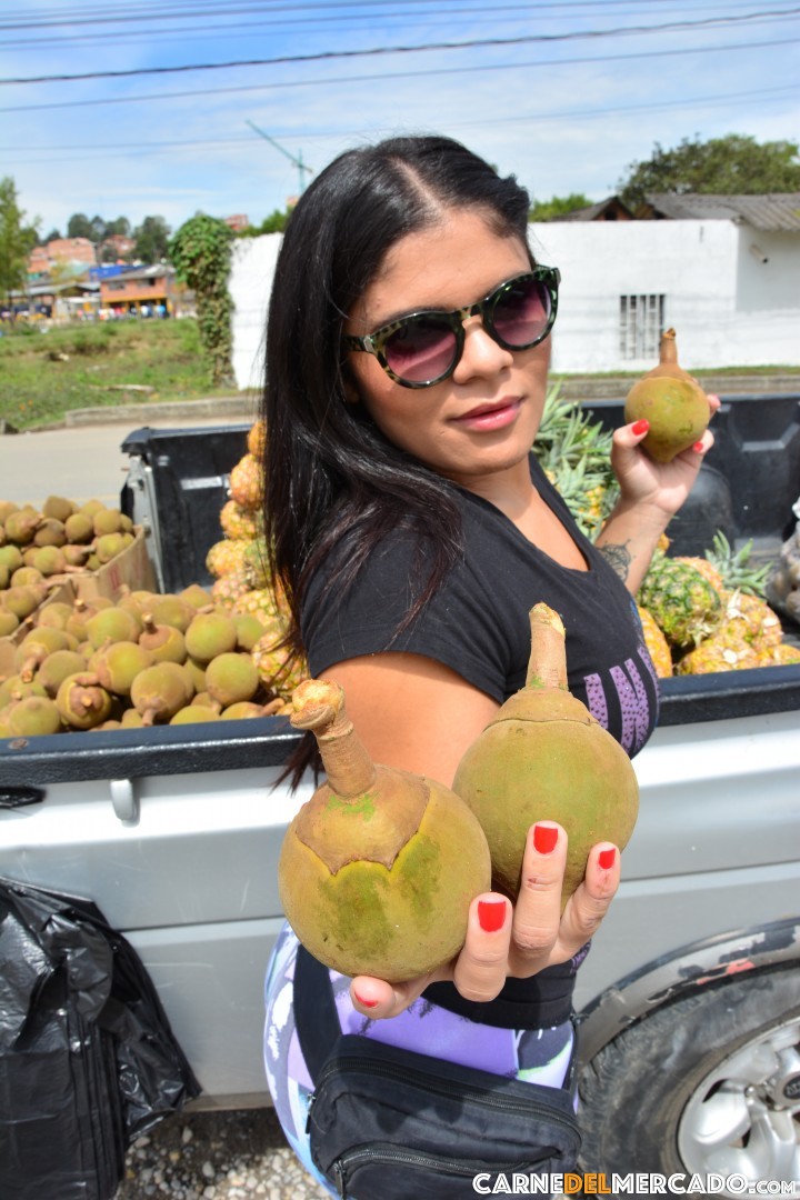 بائعة الفواكه اللاتينية تتباهى بمؤخرة فقاعية وبطيخ كبير في ملابس دانتيل - معلومات المعرض