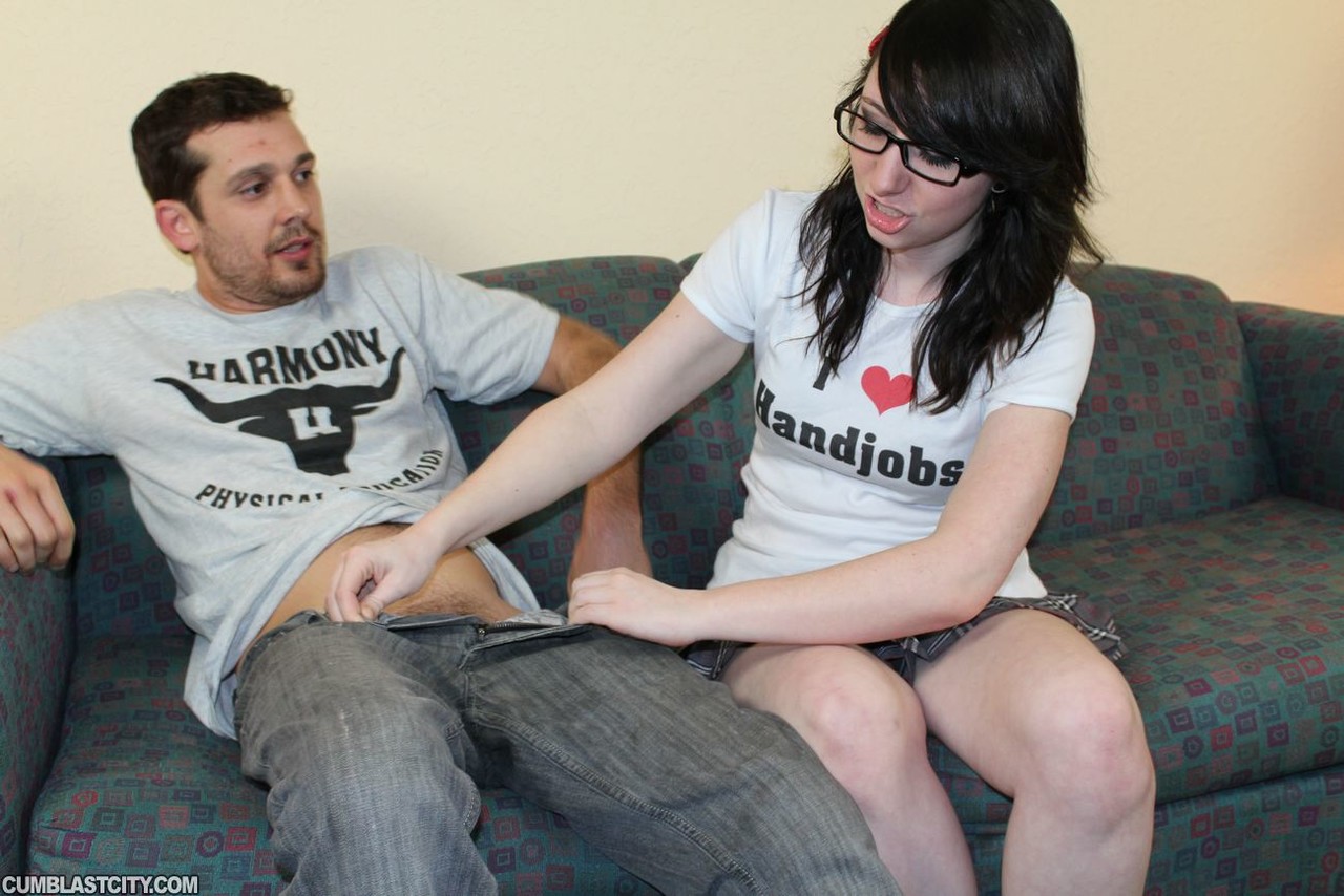 الفتاة النحيلة ذات الشعر الأسود تحرك قضيب أخيها غير الشقيق على الأريكة - معلومات المعرض