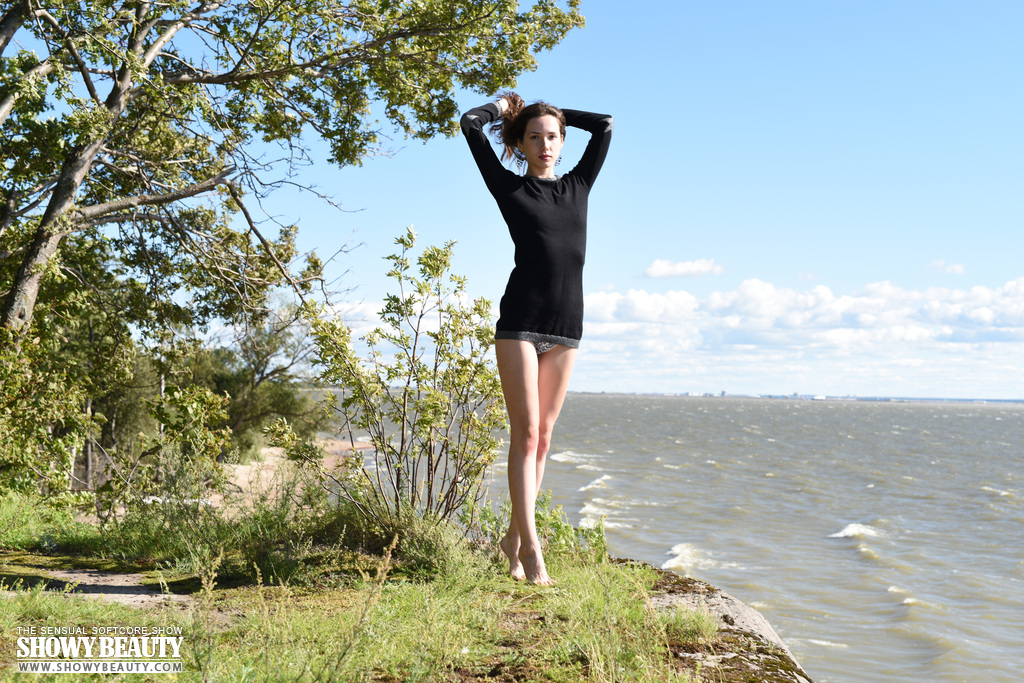 المراهقة النحيفة داما تُظهر مؤخرتها الضيقة على يديها وركبتيها فوق جرف بحر - صورة 2 / 20