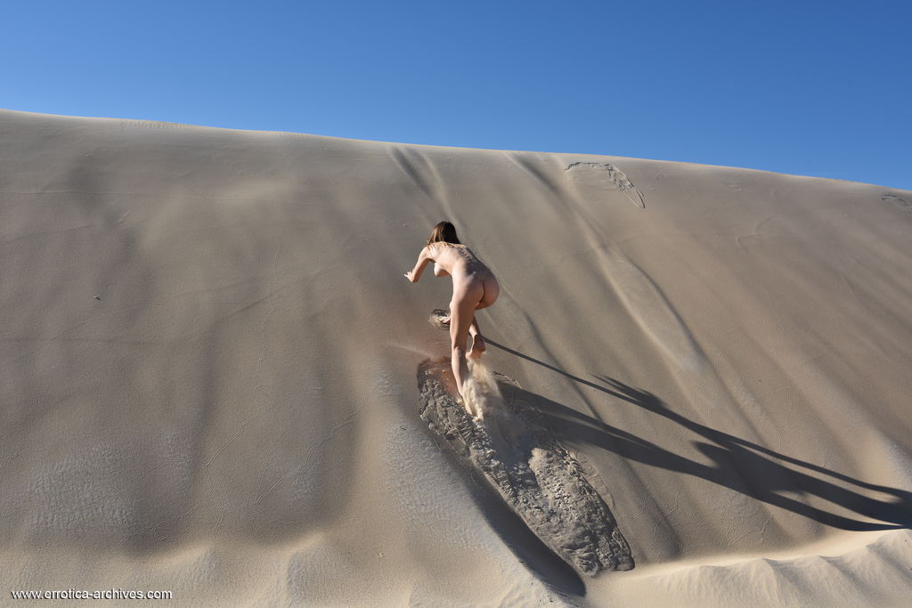 الفتاة الجميلة العارية ماكسا تصعد وتهبط الكثب الرملي - معلومات المعرض