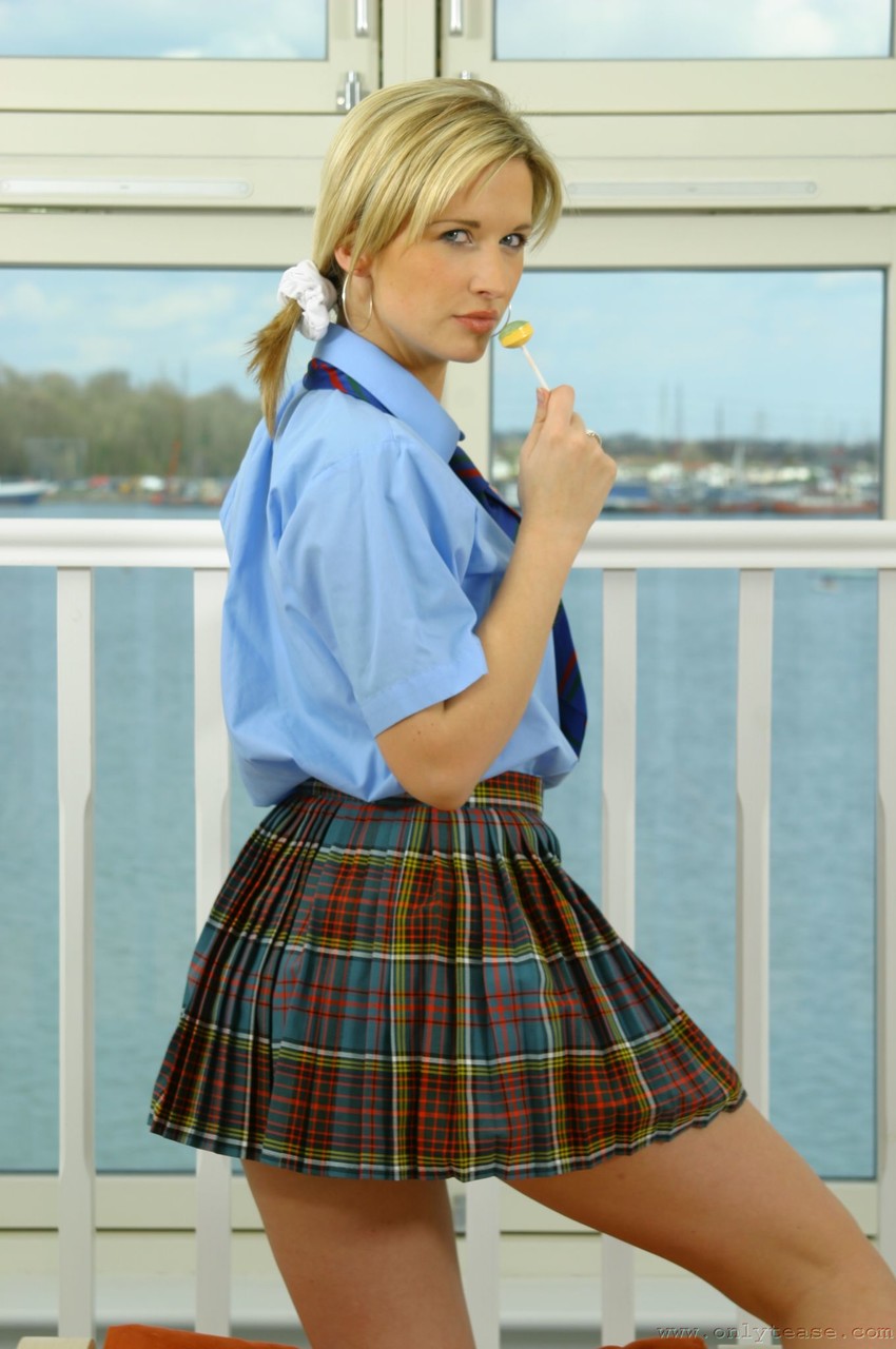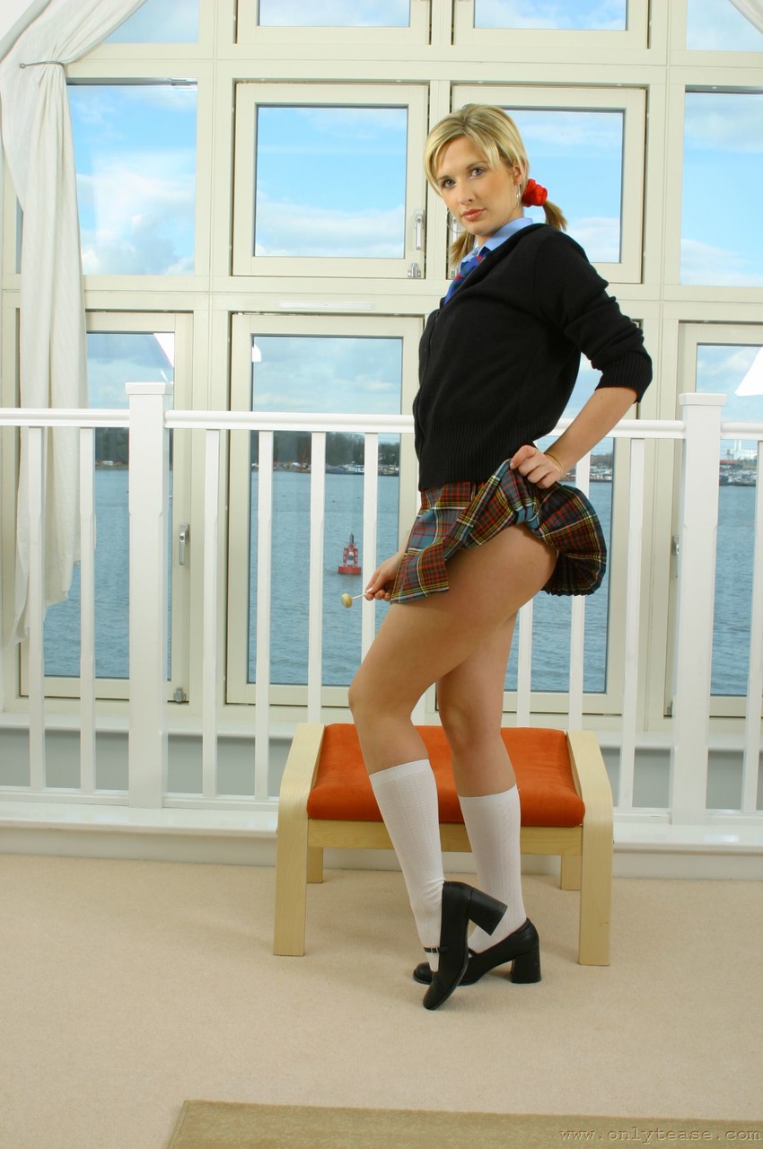 الفتاة النحيفة ليا بزيها المدرسي تغازل، تتعري ببطء حتى بقي عليها فقط سرير أبيض وجوارب طويلة، تكشف تحت التنورة بأوضاع انحناء وصور مقربة للملابس الداخلية.
