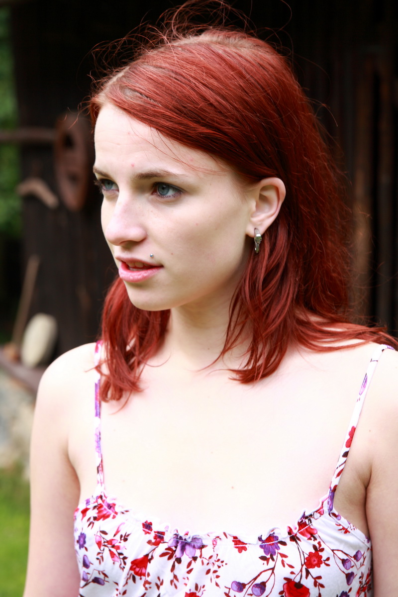 المراهقة حمراء الشعر جار米لا تقشر فستانها لتستمني على العشب - معلومات المعرض