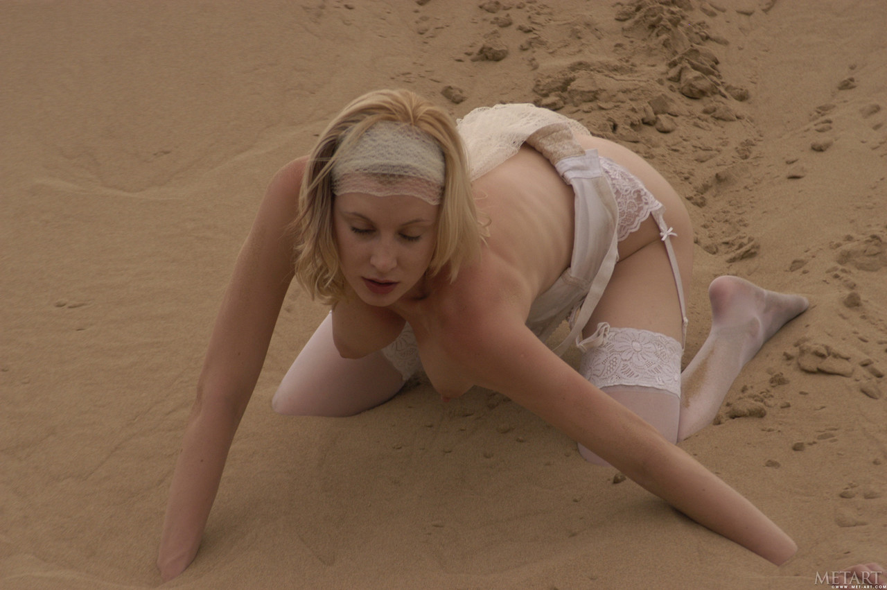 معرض ميت آرت نارسيس عاري في الهواء الطلق: شابة شقراء تبرز مؤخرتها المشدودة، فرجها المثالي المشعر، ثدييها الصغيران، ساقيها الطويلتان بالجوارب، منحنية ومكشوفة.