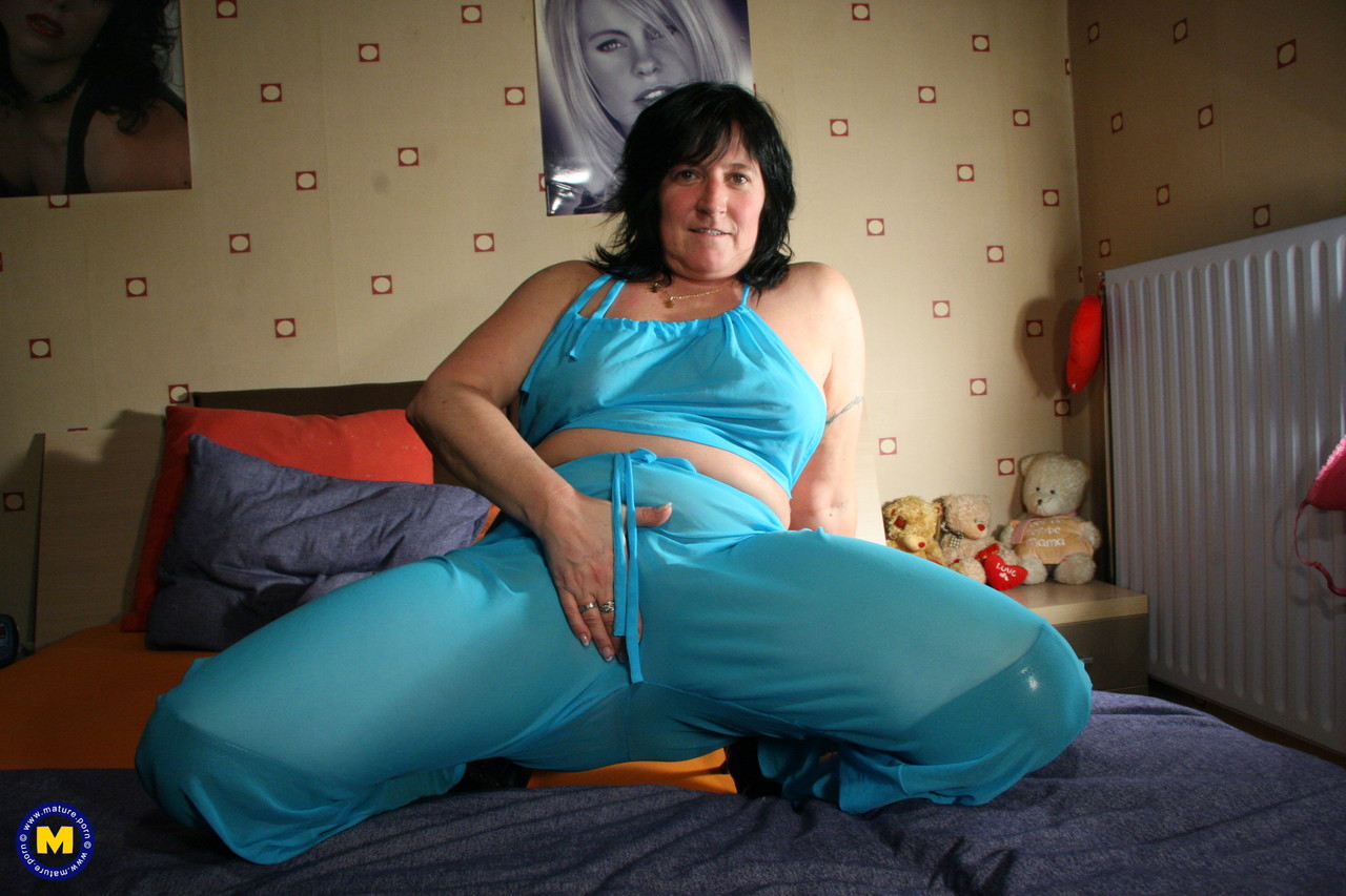 امرأة ناضجة سمينة ريتا سي تخلع سراويلها الزرقاء، وتفتح فخذيها السمينين وتلعب بشفرتها في لقطة قريبة، معرضة ثدييها وشرجها.