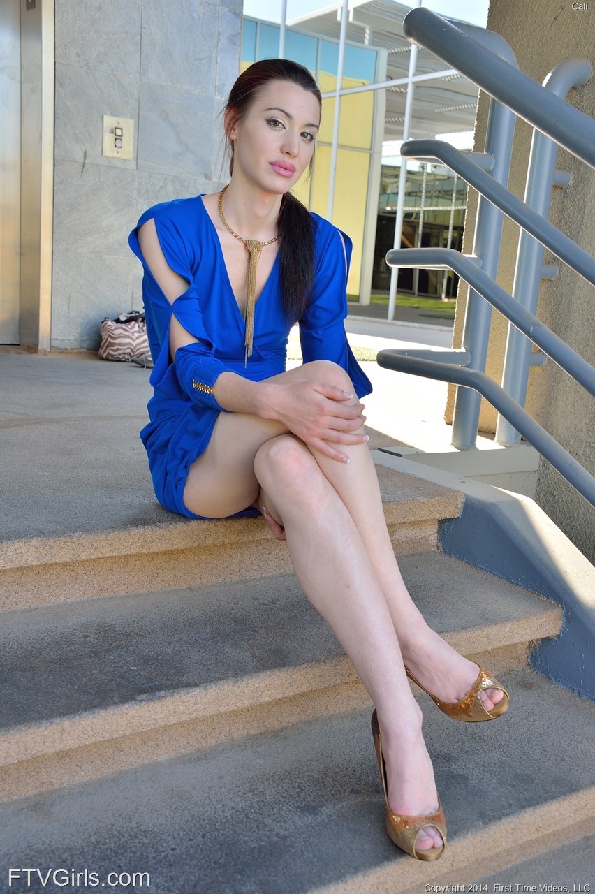المراهقة الحلوة كالي تتنزه في فستان أزرق وتستمني في الهواء الطلق على الدرجات - معلومات المعرض