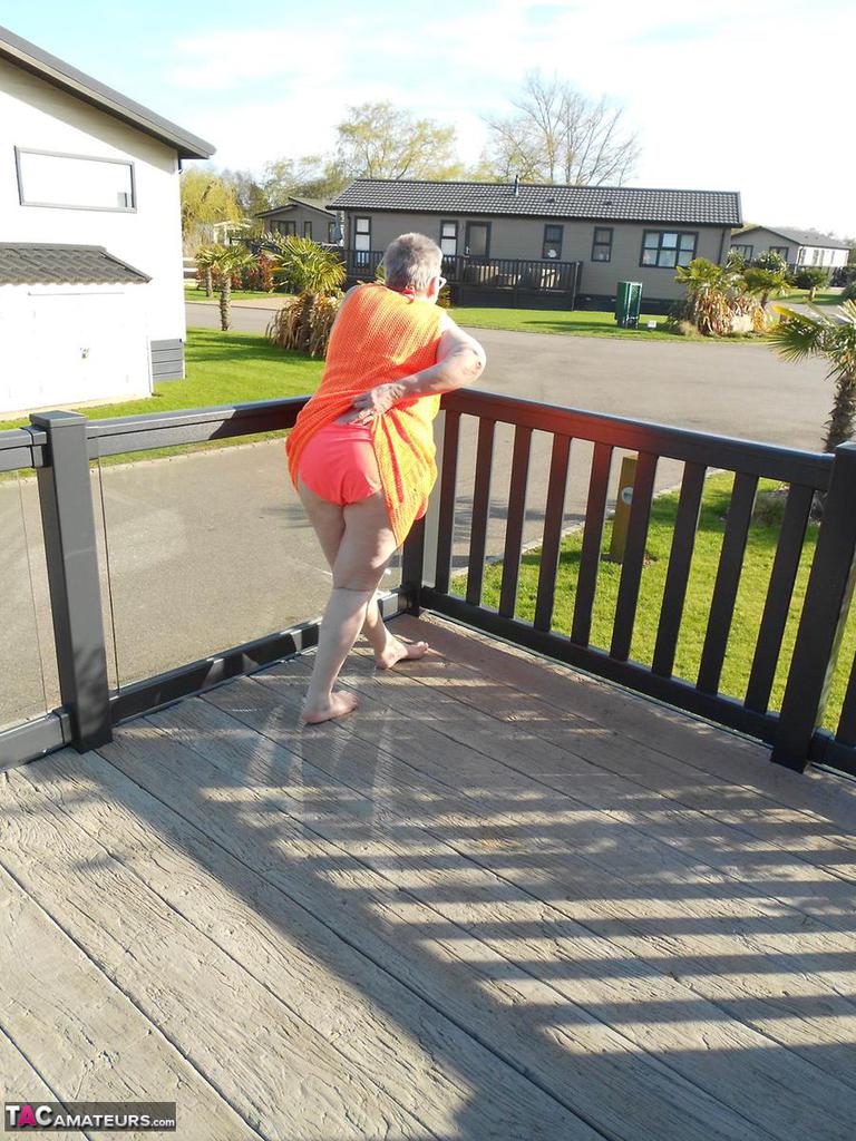 نان السمينة تكشف عن صدرها الكبير في حوض الاستحمام الساخن على الفناء ثم تعري نفسها على السرير - معلومات المعرض