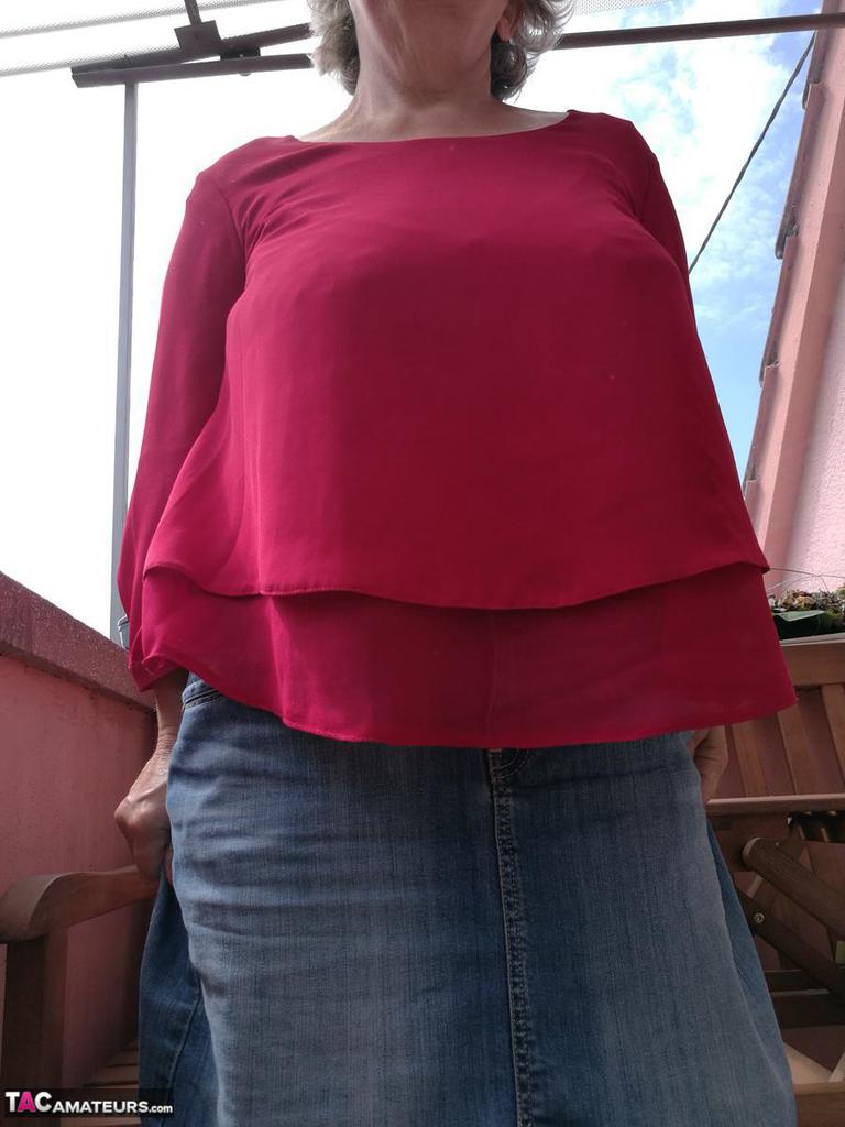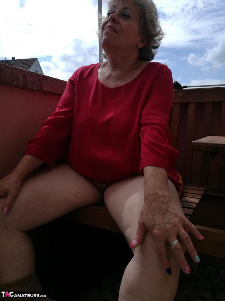 جدة تثير في ملابس داخلية و كعب عال، و تبرز مهبلها المتجعد تحت التنورة في الفناء. جدة محترفة تبلغ من العمر أكثر من 70 عاماً تخلع ملابسها، و تظهر مقربة من مؤخرتها و ساقيها.