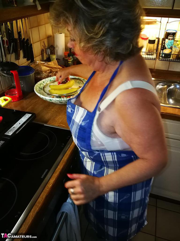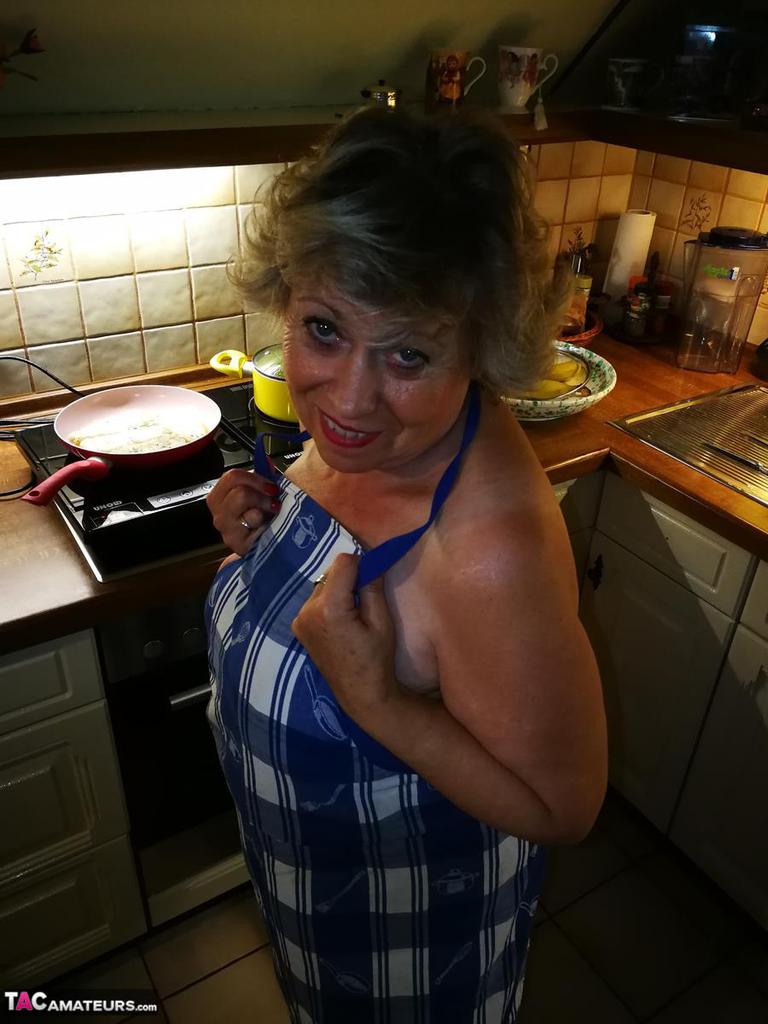 كارو، ربة منزل كبيرة، تتعري في مريلة المطبخ وجوارب - معلومات المعرض