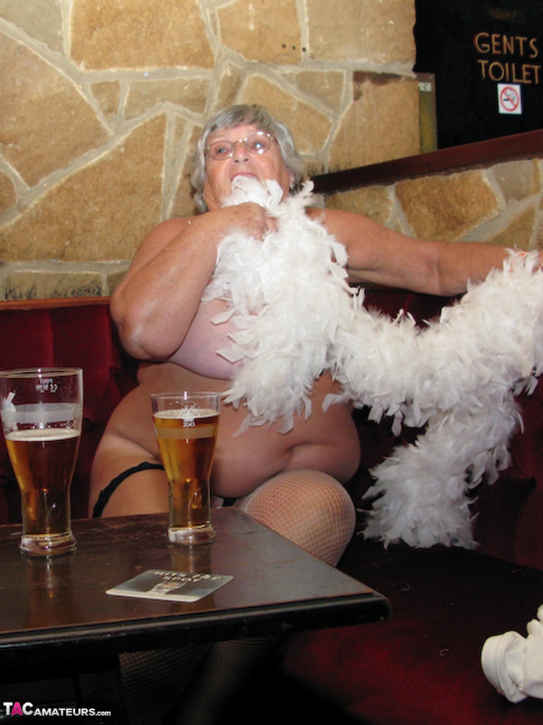 الجدّة البريطانية ذات الصدر الكبير ليبي تتعري تمامًا في الحانة أثناء شرب البيرة. السيدة البريطانية السمينة جدًا بثديين هائلين متدليين وجسم ممتلئ تُظهر مفاتنها الضخمة في مكان عام.