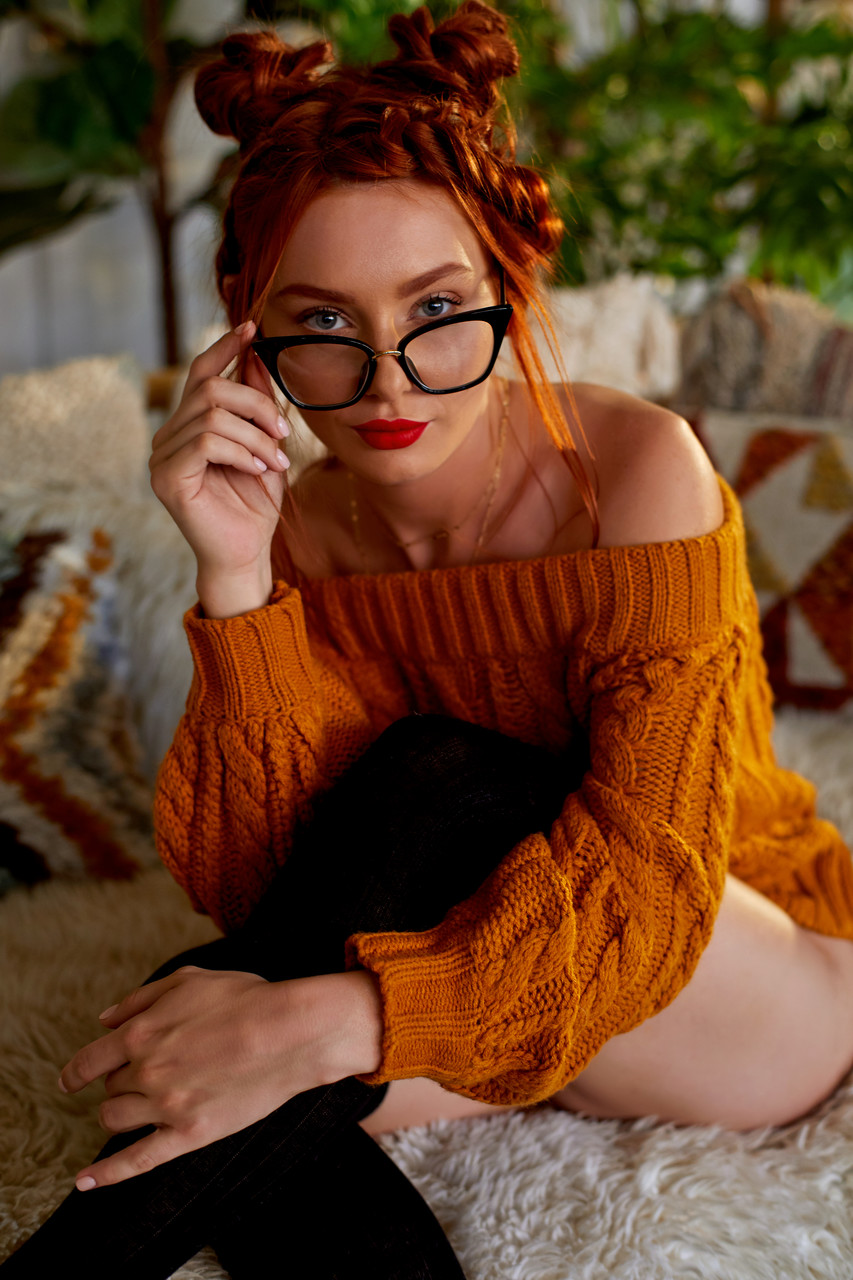 جميلة حمراء الشعر لاسي لينون في النظارات والجوارب - معلومات المعرض