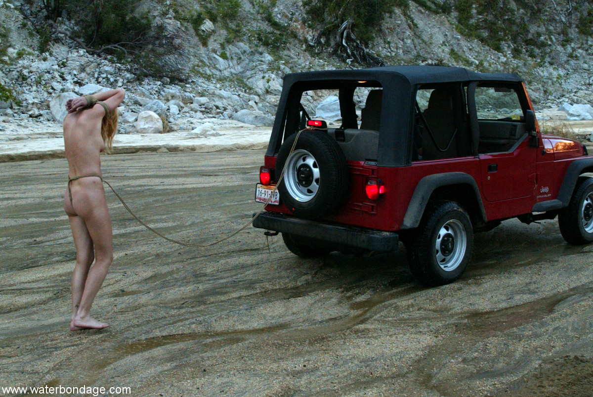 أمريكية خاضعة تمشي عارية مربوطة إلى جيب على الشاطئ - معلومات المعرض