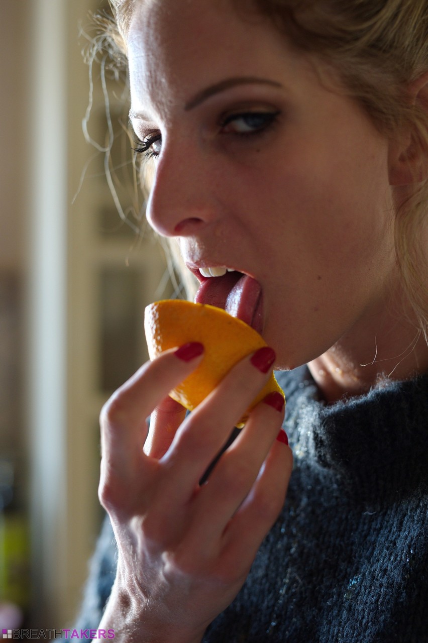الشقراء الطويلة ريبيكا ليا تأكل البرتقال وتُطلق ثدييها الكبيرين من البلوفر - معلومات المعرض