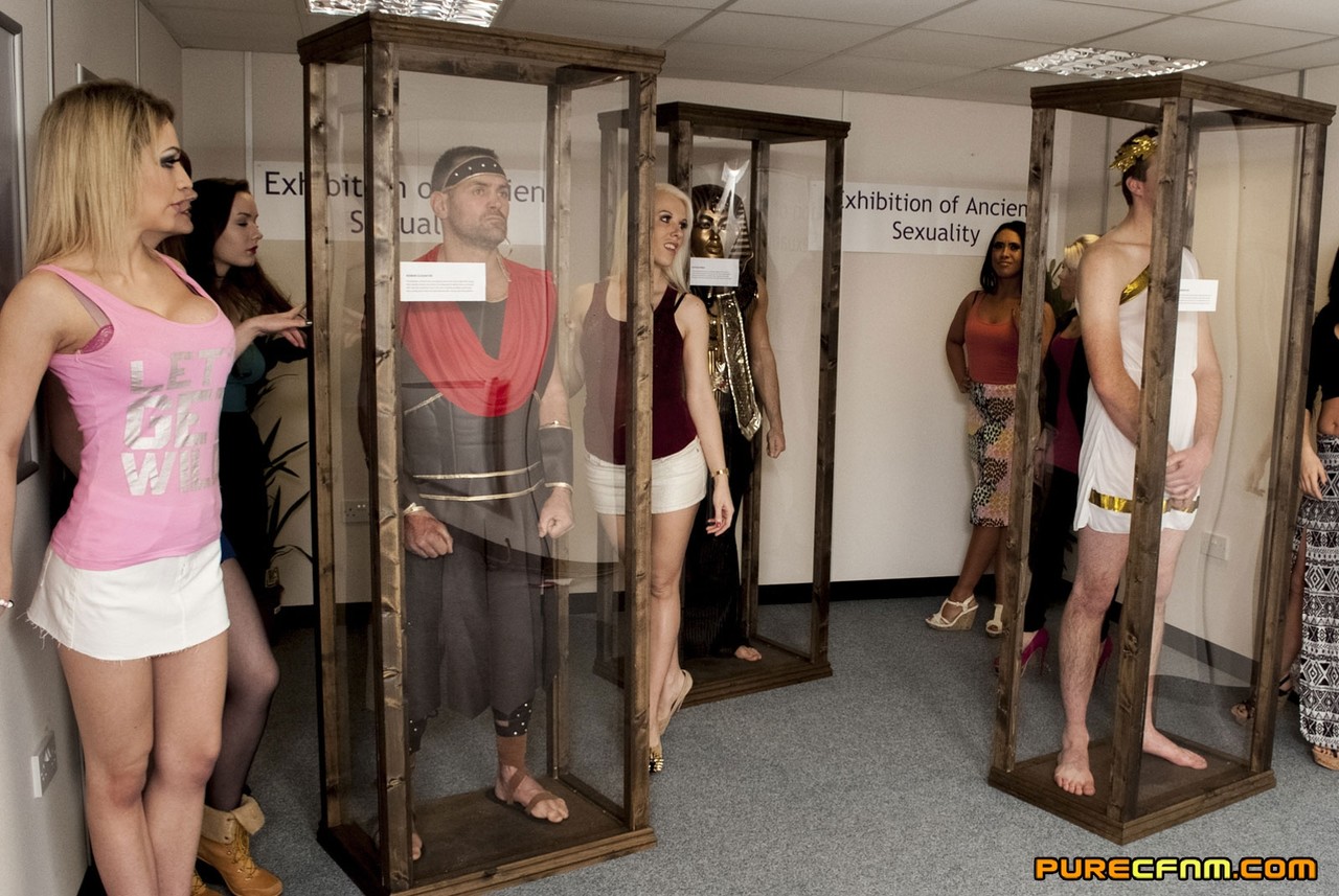 فتيات بريطانيات ساخنات من نوع CFNM يرتدين جينز ضيقا يشاهدن شاب روسي عاري من نوع إيمو يلمس نفسه في متحف — فتيات شقراوات وسمرات بيضاوات يغويه بينما يلمس نفسه لعيونهن فقط.