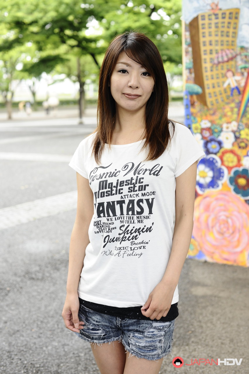 الفتاة اليابانية المنفردة تومومي ماتسودا تتصور في الهواء الطلق بقميص تي شيرت وشورت جينز - معلومات المعرض