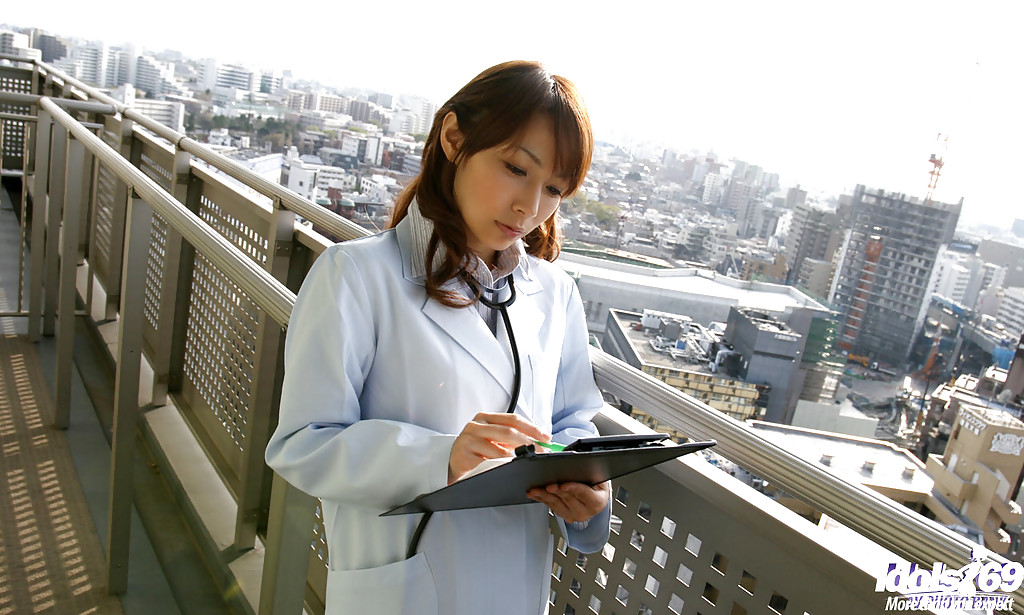 الطبيبة الآسيوية الخبيثة في النظارات تكشف عن ثدييها اللطيفين مع الحلمات الصلبة - معلومات المعرض