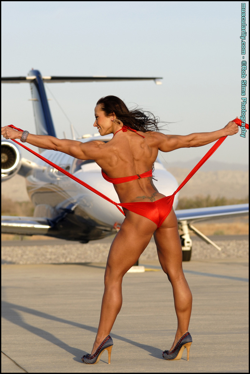 باتريشيا بيكمان، بناء الجسم milf، تبدي صدر كبير في بيكيني أحمر بالقرب من طائرة خاصة - معلومات المعرض