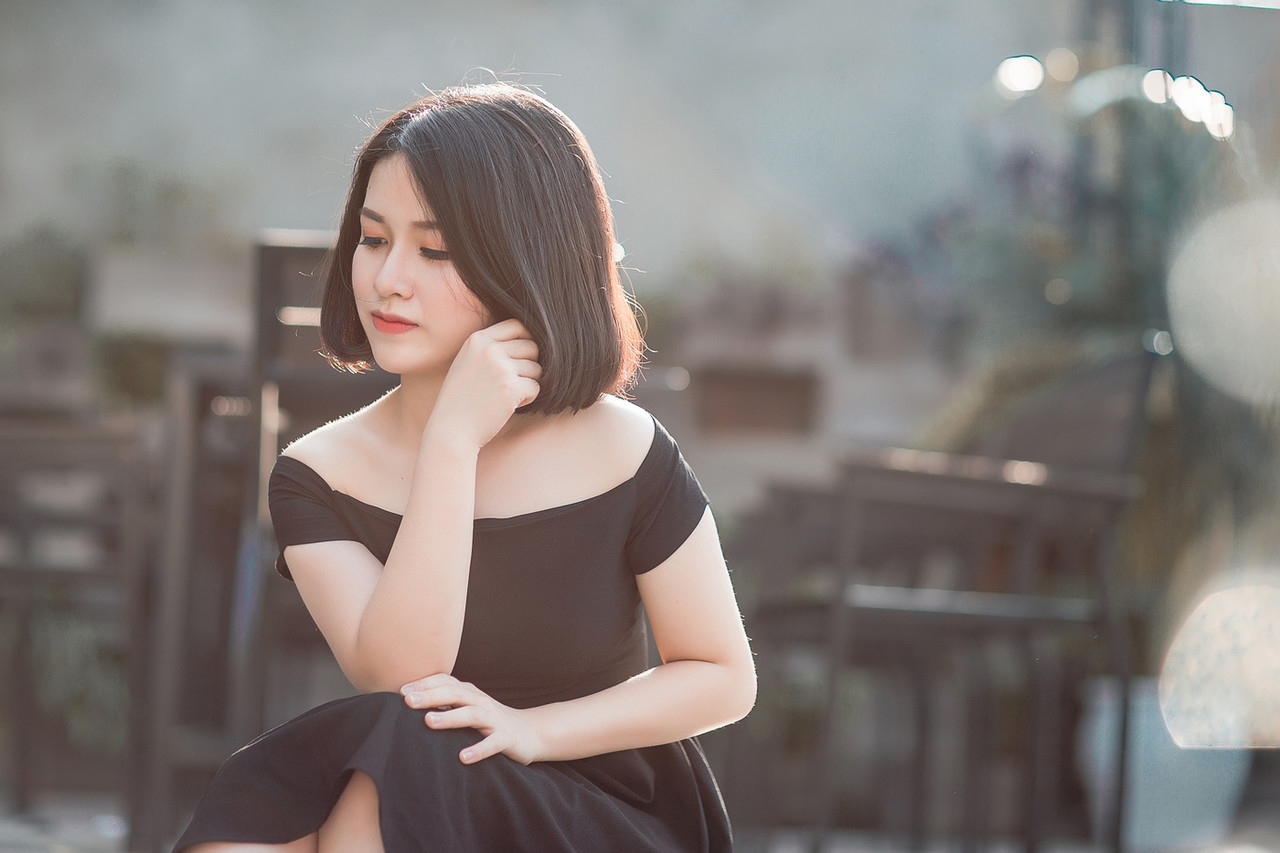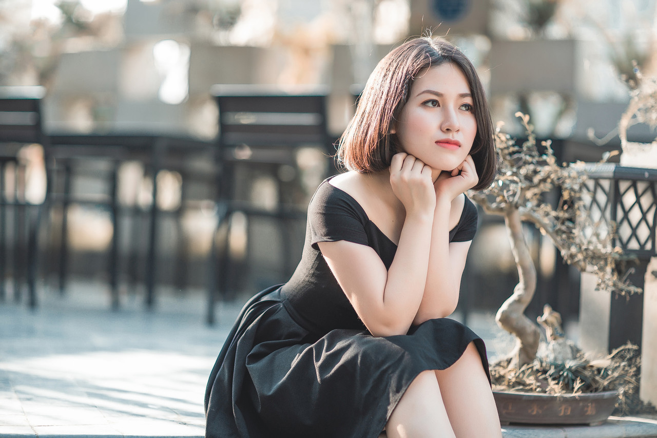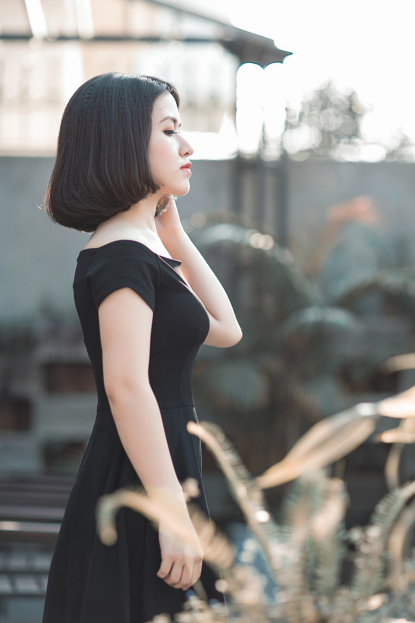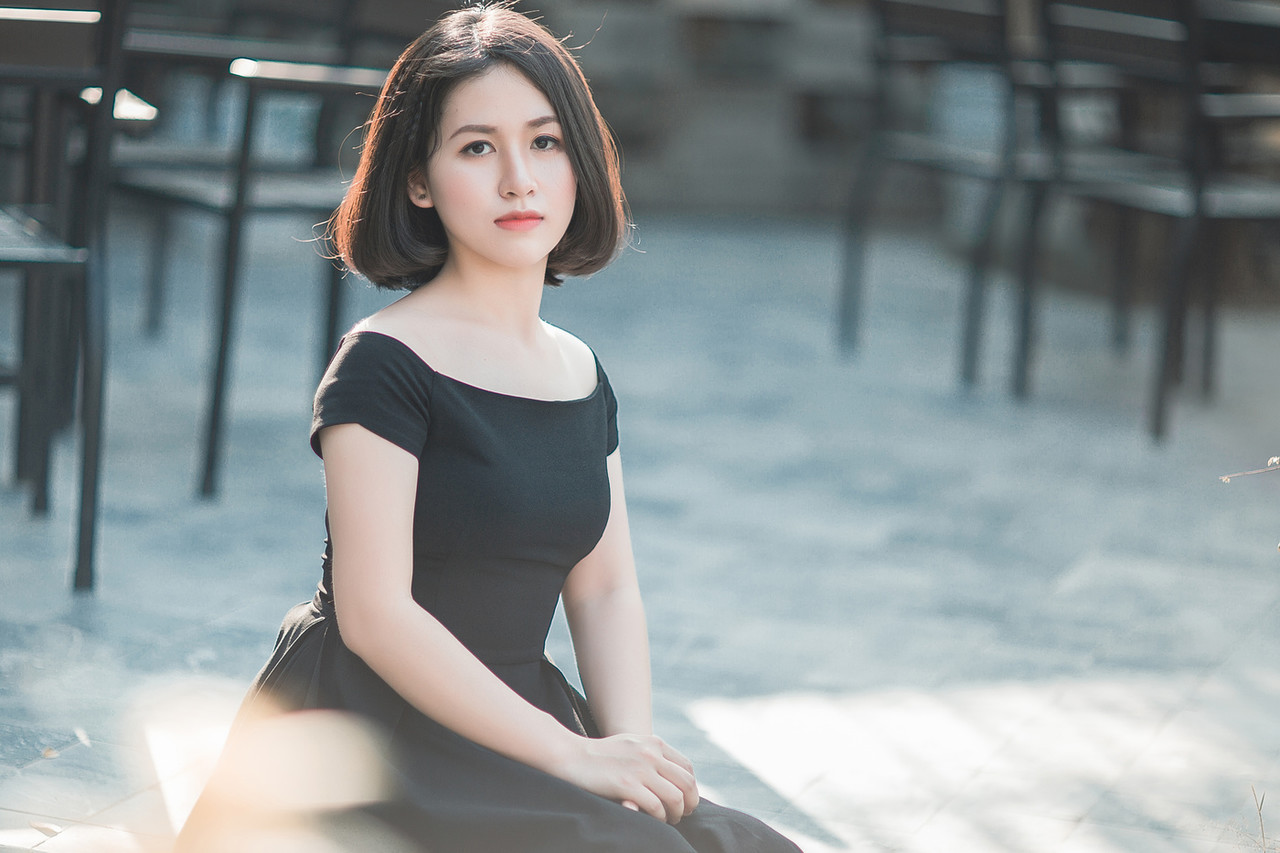 فتاة آسيوية جذابة تتباهى بثوبها الأسود الأنيق في مكان عام