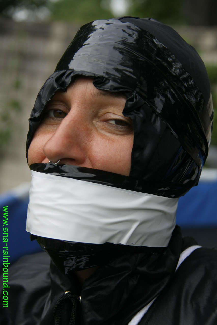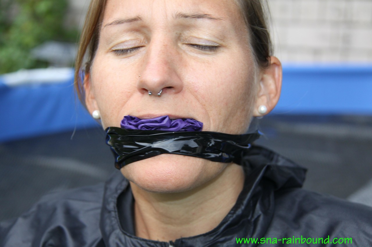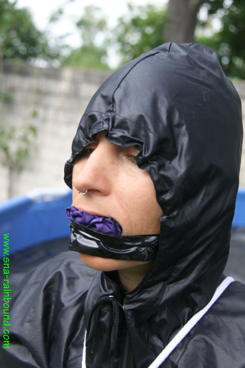 امرأة هاوية ساندرا مكممة ومربوطة إلى حمام السباحة بالمعطف المطري - معلومات المعرض